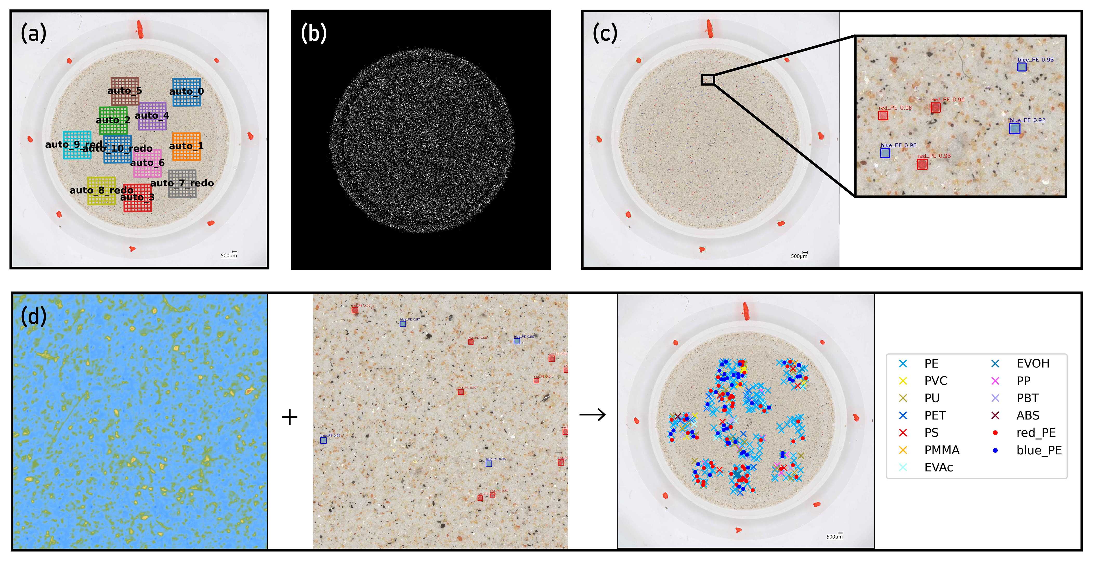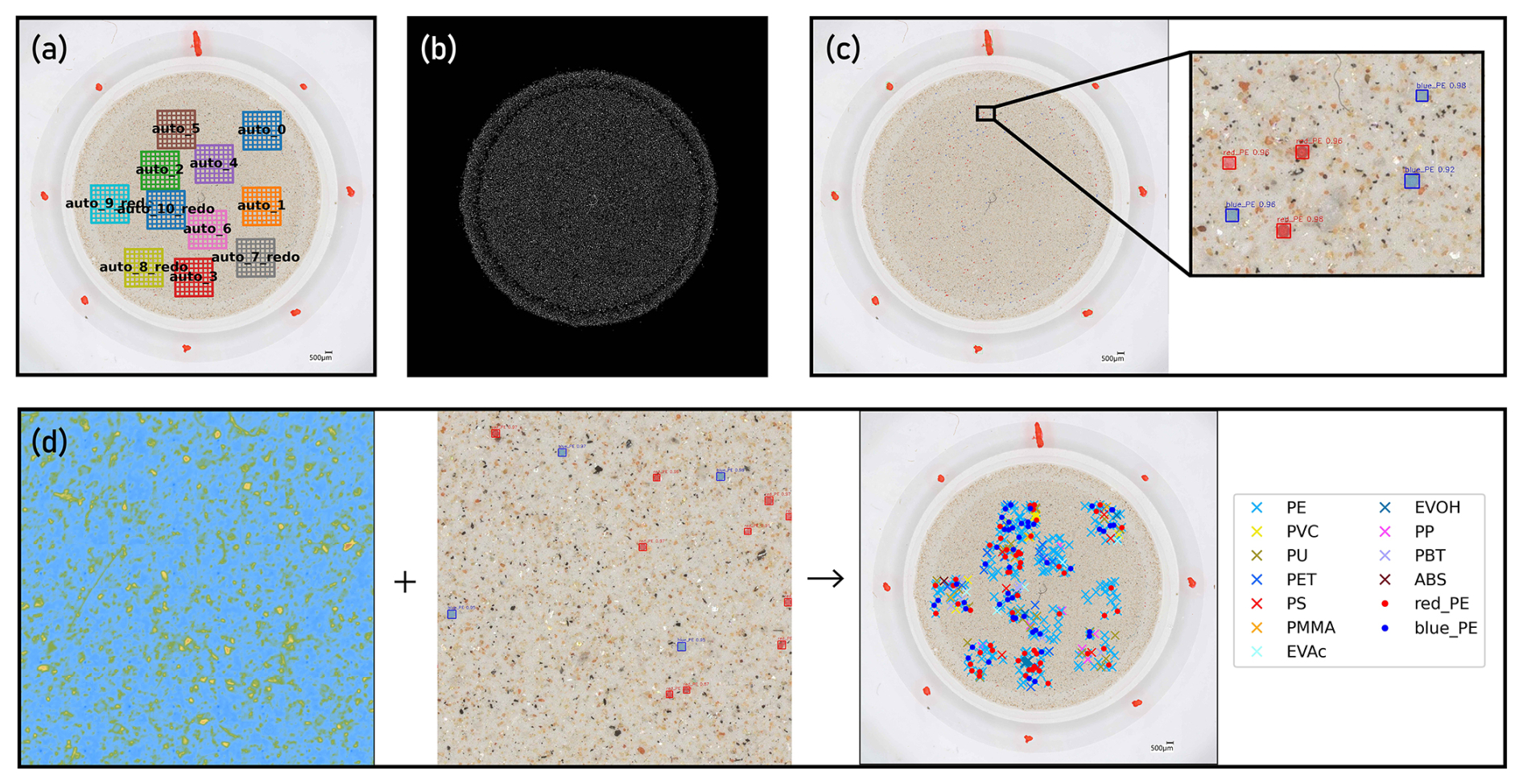 Figure 3Features of a custom software platform “YAMANAKA” for the quantification of microplastics (MPs) based on correlative optical microscopy and FPA-μ-FTIR spectroscopy. (a) Generation of random subsampling windows across Anodisc filter (optical image shown) for FPA-μ-FTIR spectroscopy; (b) Analysis of the total number of particles on an Anodisc filter based on its optical image (processed image shown); (c) Analysis of the total number of surrogate standards on an Anodisc filter based on its optical image; (d) correlation of results obtained through FPA-μ-FTIR spectroscopy (left panel) and optical microscopy (middle panel) for the calculation of surrogate recoveries as well as determination of environmental MPs in a sample (right panel).