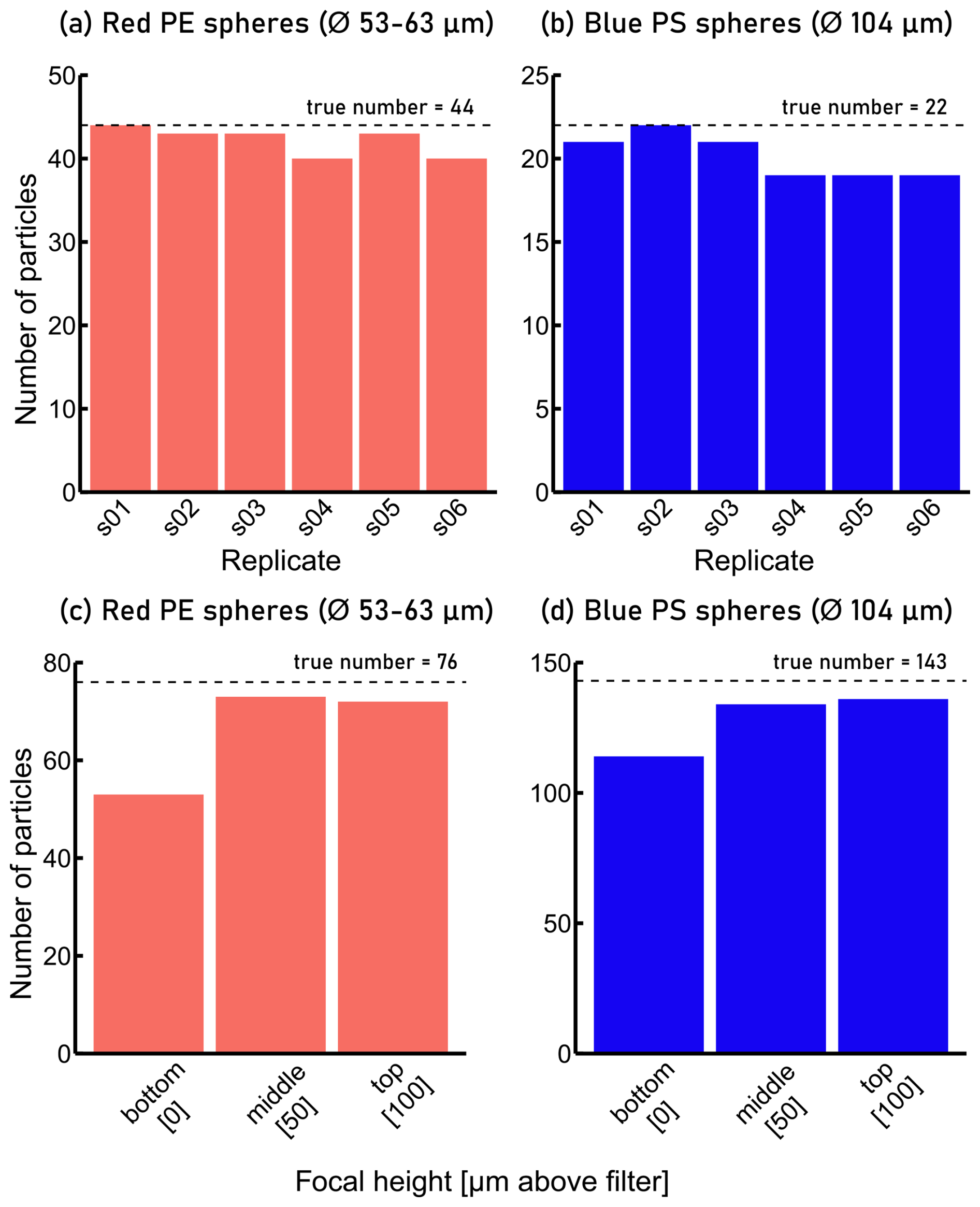 Figure 4(a) Number of spherical red polyethylene (PE) particles identified during replicate FPA-μ-FTIR measurements compared to the true value of 44 particles observed on an optical microscopy image, (b) number of spherical blue polystyrene (PS) particles identified during replicate FPA-μ-FTIR measurements (true value: 22 particles), (c) number of spherical red PE particles identified during FPA-μ-FTIR measurements at different focal heights (true value: 76 particles), (d) number of spherical blue PS particles identified during FPA-μ-FTIR measurements at different focal heights (true value: 143 particles). In (c) and (d), “bottom”: IR beam focused on the filter surface (red PE and blue PS spheres appeared blurry), “middle”: IR beam focused ∼ 50 µm above the filter surface (red PE spheres in focus, blue PS spheres slightly blurred), “top”: IR beam focused ∼ 100 µm above the filter surface (red PE spheres slightly blurred, blue PS spheres in focus).
