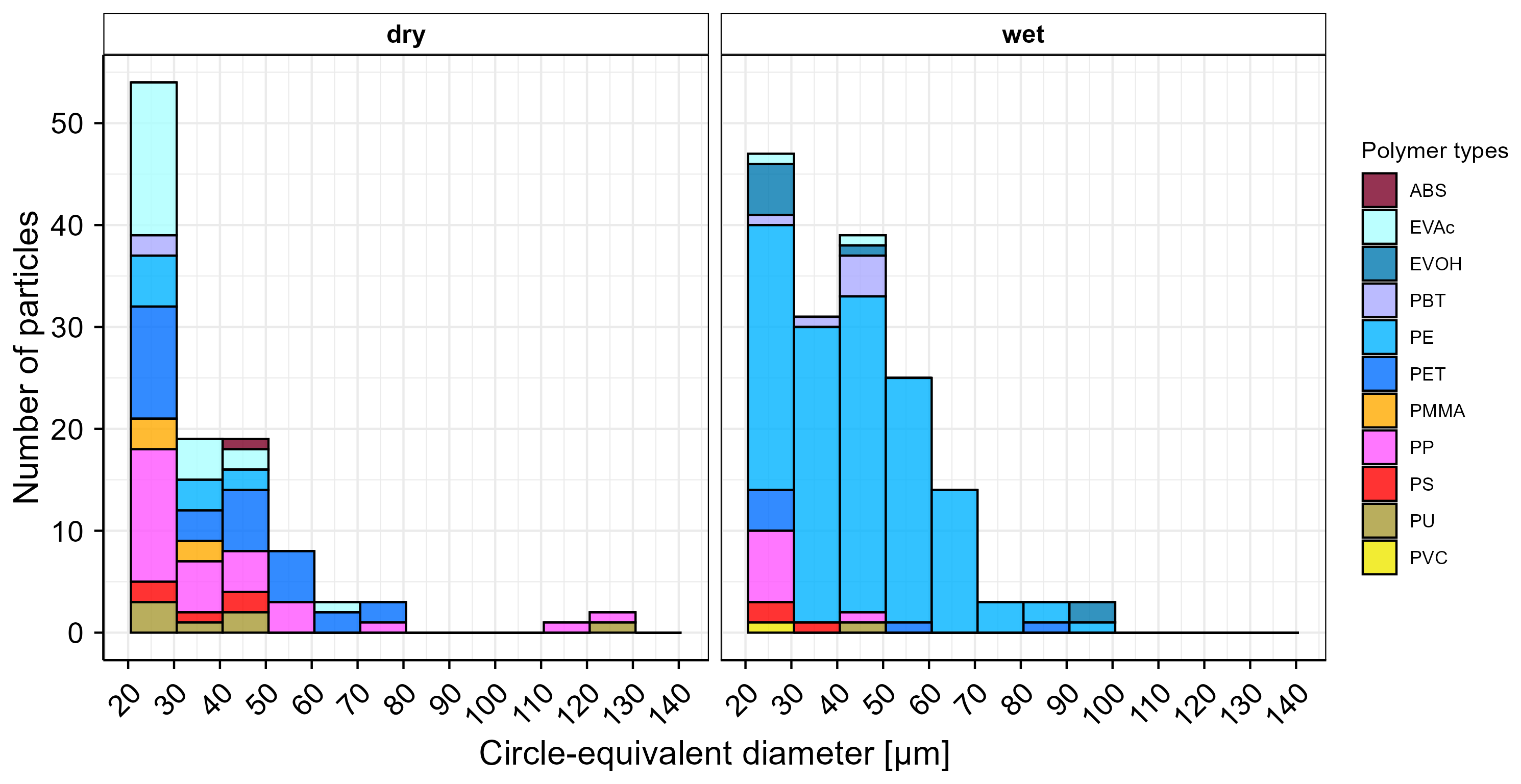 Figure 5Number of microplastics by polymer type and size detected in the analyzed subsamples of dry deposition (left) and wet deposition (right) samples collected from Duebendorf, Switzerland between 18 July and 15 August 2025. ABS = acrylonitrile butadiene styrene, EVAc = ethylene vinyl acetate, EVOH = ethylene vinyl alcohol, PBT = polybutylene terephthalate, PE = polyethylene, PET = polyethylene terephthalate, PMMA = polymethyl methacrylate, PP = polypropylene, PS = polystyrene, PU = polyurethane, PVC = polyvinyl chloride. Circle-equivalent diameter refers to the diameter of a circle with an area equivalent to the measured area of the particle's 2D projection.