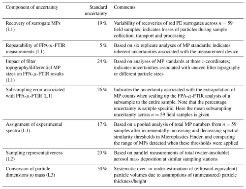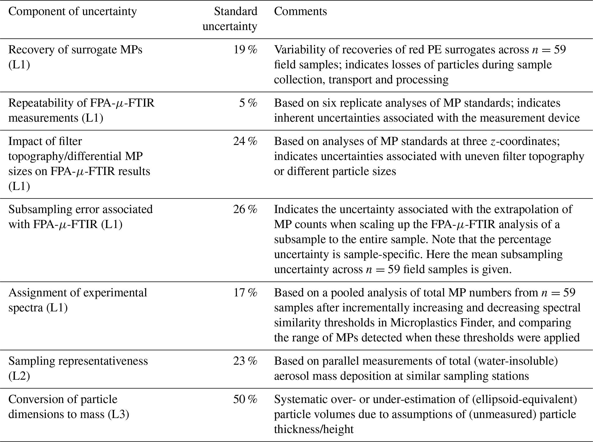 Table 1Individual components of uncertainty of our analytical chain for the quantification of microplastics in wet and dry atmospheric deposition samples and their relative standard uncertainties. The individual standard uncertainties can be combined to calculate the total measurement uncertainty of the analytical chain (see Sect. 4.8). MPs = microplastics; PE = polyethylene, FPA-μ-FTIR = focal plane array μ-Fourier transform infrared spectroscopy; L1 = level 1 uncertainties related to the quantification of MP numbers on an Anodisc filter; L2 = level 2 uncertainty related to the extrapolation of MP deposition rates; L3 = level 3 uncertainty related to the conversion of MP number and size information to MP mass.