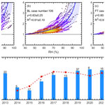 Figure 5 presents the probability density distribution of the particle backscatter coefficient enhancement factor fref(RH) for 192 identified cases from lidar observations during 2010–2024. The average R2 value of 0.91 indicates a good fit with the Hänel parameterization for most cases. The average γ value was 0.62 ± 0.24, represented by the blue curve and shaded area, corresponding to fref-Hänel(85 %) of 2.36, with a range of 1.69–3.29 when including the standard deviation. The γ value in the BL (0.63 ± 0.25) was comparable to that in the FT (0.60 ± 0.24). The mean RH in the lower and middle troposphere was 71.2 ± 12.5 % (68.4 ± 12.0 % in the BL and 75.3 ± 12.1 % in the FT), corresponding to the highest probability density area (in yellow). This suggests that most hygroscopic growth of urban anthropogenic aerosols in Wuhan occurred under high RH conditions of around 60 %–80 %. The particle backscatter coefficient enhancement factor fref-Hänel(85 %) exhibited a broad distribution from 1.32 to 4.53, corresponding to γ values of 0.20–1.09, likely reflecting the diverse hygroscopicity properties of urban particles in Wuhan. Rapid urbanization over the past decades has exposed the city to numerous pollutants, including various water-soluble inorganic ions, elemental carbon, and organic matter, etc. (Zhang et al., 2015a). Both chemical composition and particle size significantly influence aerosol hygroscopicity characteristics (Zieger et al., 2010, 2013), resulting in a variety of hygroscopic aerosol types.