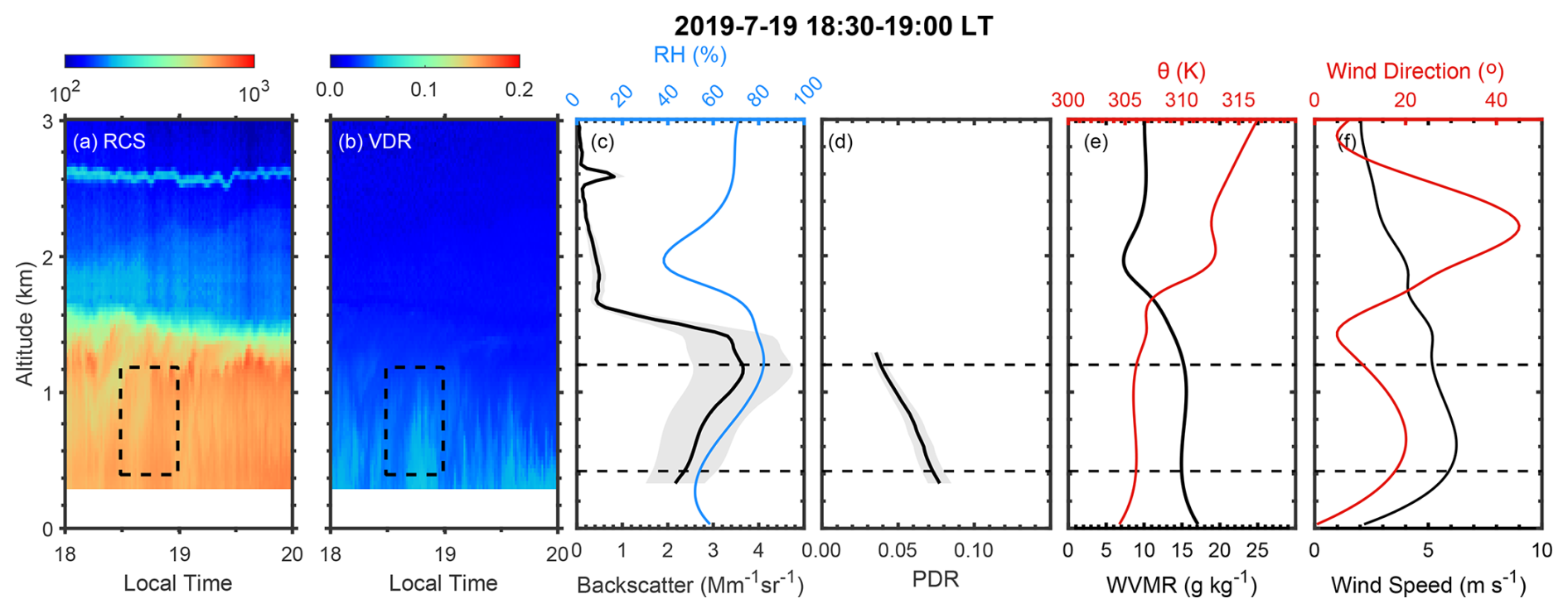 Figure 2Time-height contour plots of (a) range-corrected signal (RCS) and (b) volume depolarization ratio (VDR) measured by polarization lidar over Wuhan at 18:00–20:00 local time (LT) on 19 July 2019. Profiles of (c) backscatter coefficient and relative humidity (RH), (d) particle depolarization ratio (PDR), (e) water vapor mixing ratio (WVMR) and potential temperature, (f) wind speed and direction. The lidar-derived profiles in (c) and (d) are obtained during 18:30–19:00 LT. All the meteorological parameter profiles are obtained from the radiosonde launched at around 20:00 LT on the same day. The grey-shaded areas around the lidar profiles in (c) and (d) denote the uncertainty of lidar-derived optical properties.