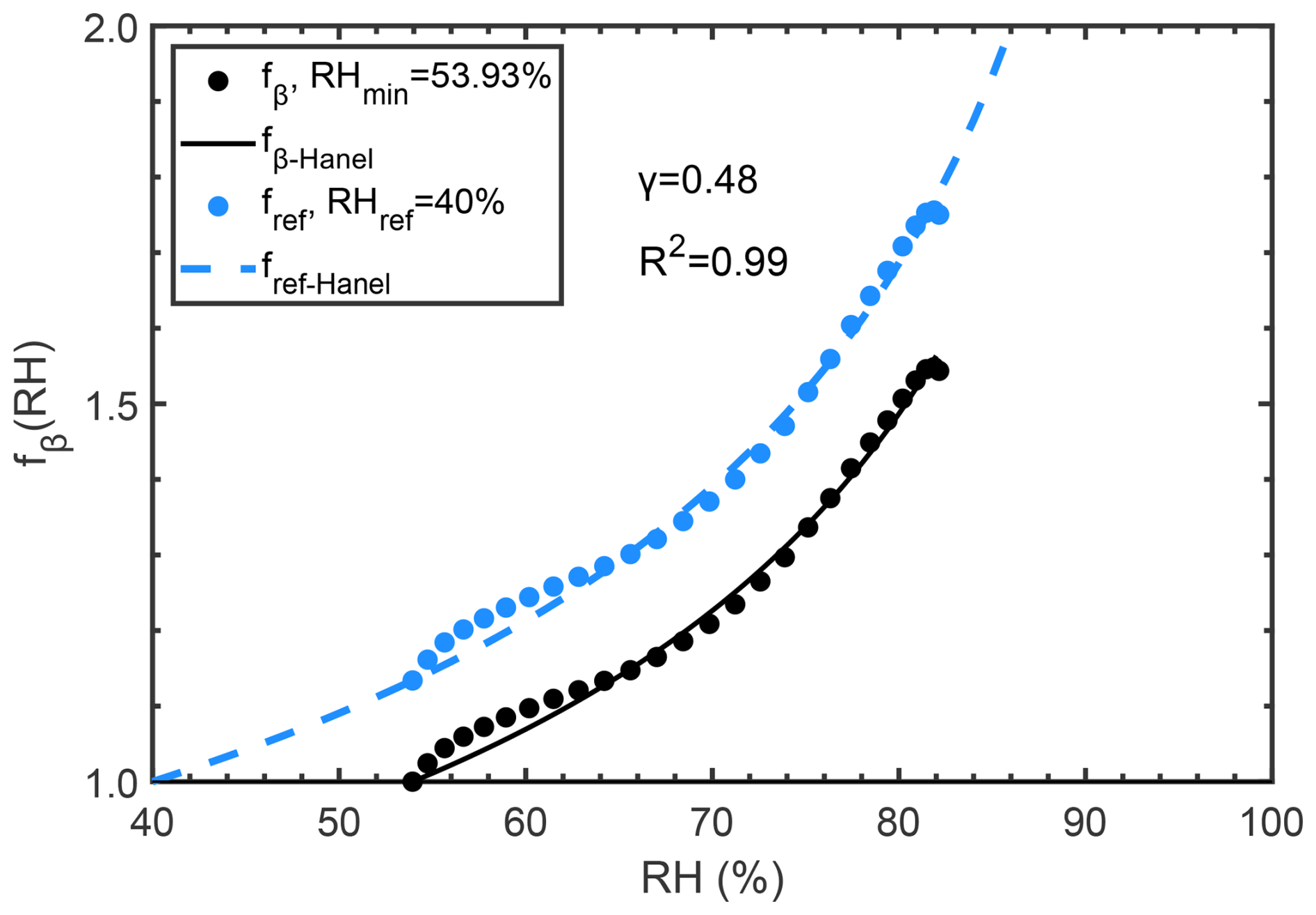 where RHref=40 %. For RH<40 %, fref(RH) was set to 1. This assumption may underestimate fref(RH) by up to 25 % for highly hygroscopic aerosols (γ>1), and by 10 %–15 % for moderately hygroscopic aerosols (γ<0.5) (Titos et al., 2016). Moreover, the uncertainty in the particle backscatter coefficient enhancement factor can reach 38 % at RH >95 % (Adam et al., 2012). The resulting fref-Hänel(RH) is shown in Fig. 4 by the blue dashed curve. At RH =85 %, fref-Hänel(RH) is 1.93, indicating that the backscatter coefficient increases by a factor of 1.93 compared to dry conditions as RH increases from 40 % to 85 %.