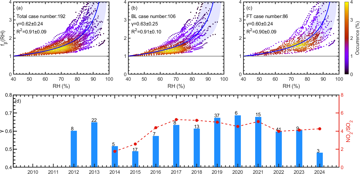 Figure 5Probability density distribution of the particle backscatter coefficient enhancement factors (RHref=40 %) of (a) 192 selected hygroscopic growth cases describing the aerosol conditions in the low and middle troposphere (0–7 km); (b) 106 cases in the boundary layer; (c) 86 cases in the free troposphere during 2010–2024. The Hänel fits (blue solid line) were calculated with the mean hygroscopic growth parameter γ=0.62. The shaded area represents the standard deviation of the Hänel fit line. (d) Bar plot of the annual mean γ during 2010–2024. The case number for each year is presented at the top of each bar. The red dashed line represents the evolution of the annual mean NO2-to-SO2 concentration ratio during 2014–2024 (Jing et al., 2025).