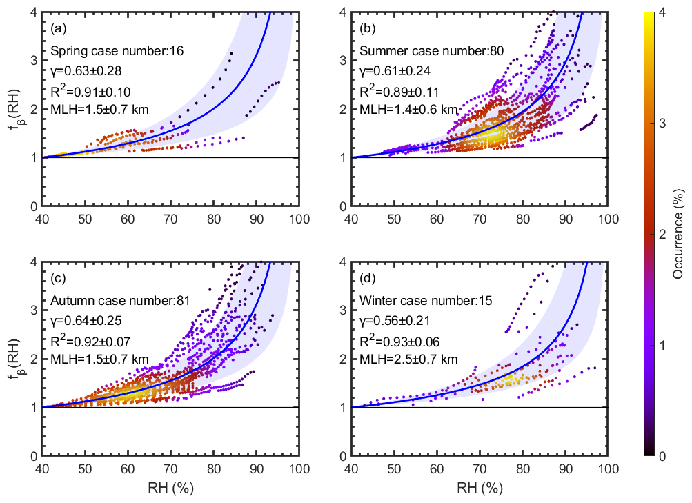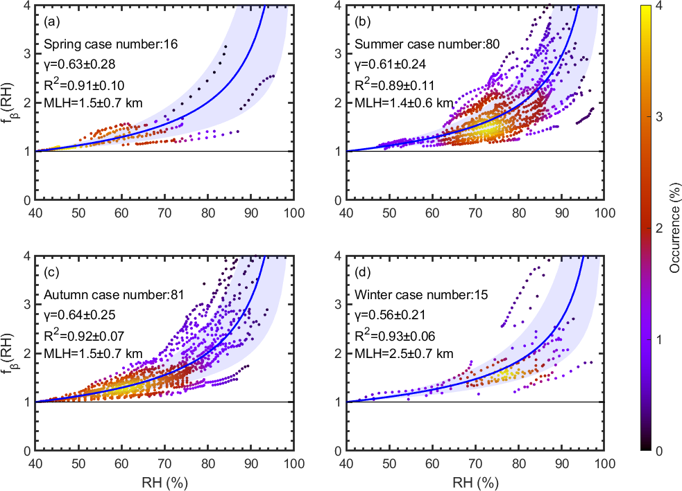 To explain why the fraction of nitrate in Wuhan is the highest in winter, while γ is the lowest (0.56), the mean layer heights (MLH) for cases in the four seasons are presented in Fig. 6. The MLH in winter is 2.5 km, higher than the 1.4–1.5 km observed in other seasons, likely due to frequent dust intrusions below 1.5 km in winter (Jing et al., 2024). However, anthropogenic aerosols in winter are usually concentrated below 1.5 km (Jing et al., 2025). Therefore, the winter analyzed here represents hygroscopic growth effect at higher altitudes in the free troposphere, where the atmosphere is relatively clean, rather than surface-level pollution. Chen et al. (2019) reported an extremely low γ of 0.1 under clean conditions, revealing that the hygroscopicity of clean air is lower than that of polluted air. Similarly, Sicard et al. (2022) found only slight seasonal variation in γ values in Barcelona, with a maximum of 0.58 in summer and a minimum of 0.53 in autumn. They interpreted this season-independent γ as recirculation layers of pollutants above the BL, caused by strong insolation, weak synoptic forcing, sea breezes, and mountain-induced winds (Pérez et al., 2004).