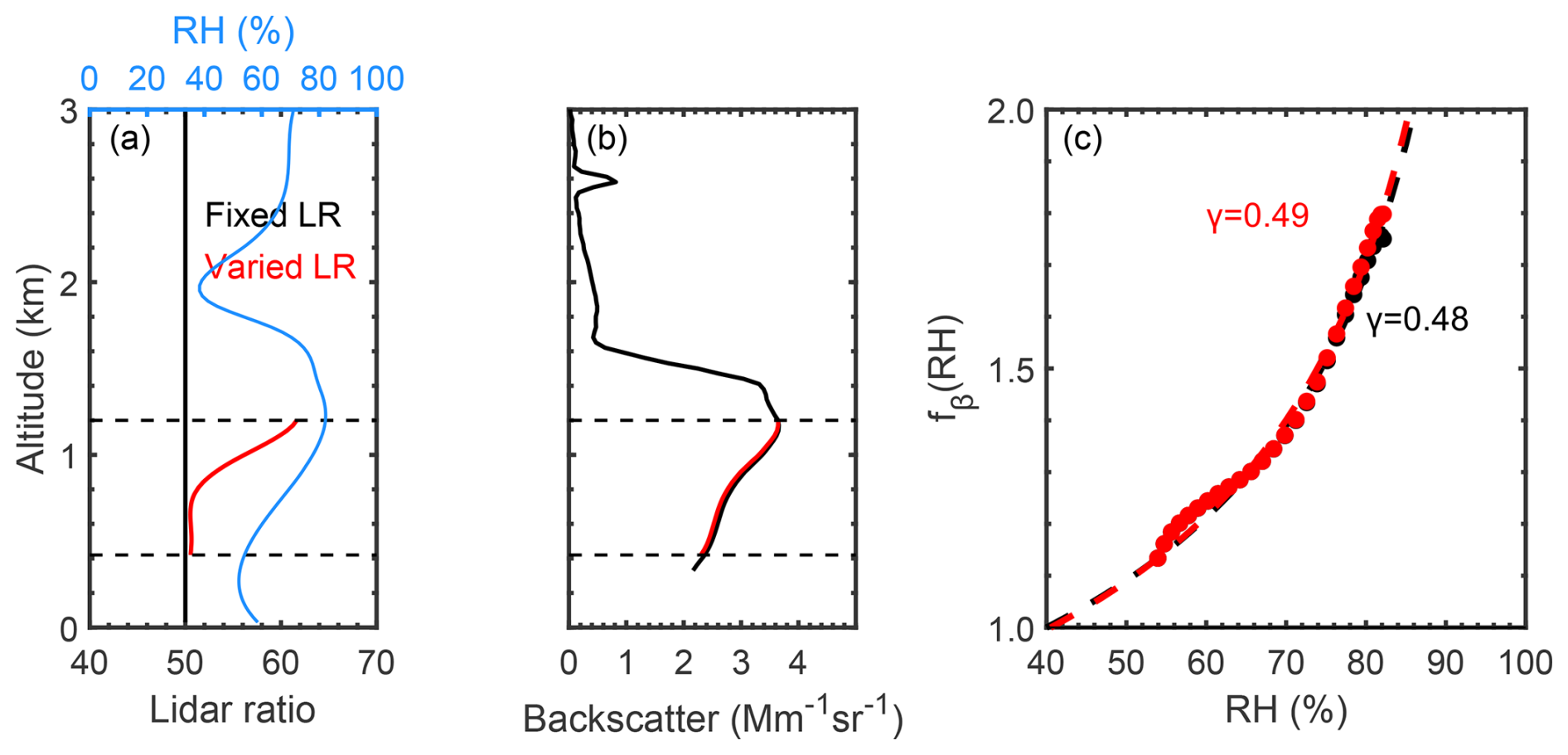 Figure 7A case to illustrate the difference of hygroscopic parameter γ between using a fixed LR and a variable LR over Wuhan at 18:30–19:00 LT on 19 July 2019. Profiles of (a) lidar ratio and RH, (b) backscatter coefficient; (c) the particle backscatter coefficient enhancement factors calculated by the Hänel method are presented. The black and red lines represent profiles derived by a fixed LR of 50 sr and variable LR, respectively.