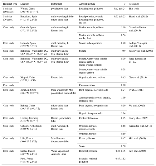 Table 3Comparisons of the 532 nm lidar-estimated hygroscopic growth parameter γ at RHref=40 %, obtained using the Hänel fitting method for pollutants or aerosol mixtures. The results from this study alongside those reported in previous studies are provided.
