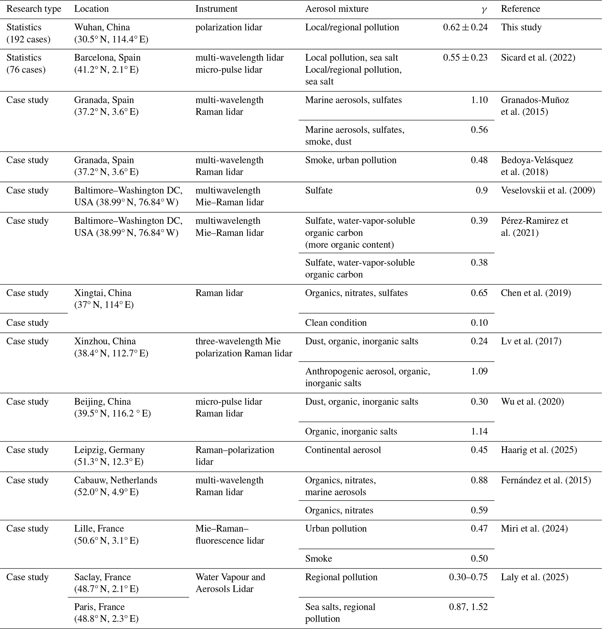 Table 3 summarizes hygroscopic growth parameters from this study in Wuhan and from the existing literature measured elsewhere. A variety of aerosol mixtures was examined, with γ values varying from 0.24 for mixtures dominated by hydrophobic particles, such as dust, to 1.1 for highly hygroscopic aerosols (e.g., marine aerosols and inorganic salts). To analyze the causes of the lidar-observed aerosol hygroscopic growth, many studies indirectly inferred the aerosol composition through backward trajectories and optical properties (e.g., Ångström exponent, complex refractive index, depolarization ratio) (Veselovskii et al., 2009; Granados-Muñoz et al., 2015; Sicard et al., 2022; Haarig et al., 2025). Miri et al. (2024) introduced fluorescence capacity, which was not affected by water vapor, to distinguish aerosol components (with biological aerosols exhibiting higher fluorescence, and pure dust or urban aerosols demonstrating lower fluorescence). Ground-based aerosol chemical speciation monitor (ACSM) was also used to explain the hygroscopic growth behavior of aerosols through ground-level chemical composition analysis (Lv et al., 2017; Bedoya-Velásquez et al., 2018; Chen et al., 2019; Wu et al., 2020). Pérez-Ramirez et al. (2021) provided the first airborne in situ measurements for chemical composition determination, confirming that sulfates and water-soluble organic carbon are the main contributors to the aerosol hygroscopic growth observed by lidar, with γ values of 0.38–0.39. In addition, Laly et al. (2025) combined lidar-based hygroscopic growth estimation with chemical species data from the Copernicus atmospheric monitoring service (CAMS), showing that γ was significantly higher in regional pollution cases affected by sea salt (0.87 and 1.52) compared with those without sea salt influence (0.30–0.75).