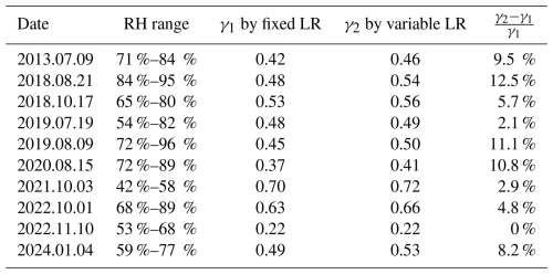 where LRdry represents the LR under dry conditions. The fixed LR of 50 sr represents an average value derived from combined lidar and sun photometer measurements in the ambient troposphere (Takamura et al., 1994). Based on radiosonde data, the average RH in the lower troposphere over Wuhan is approximately 40 %–70 % (Guo et al., 2023). Accordingly, LRdry=47 sr in Eq. (7) was set, such that an LR of 50 sr corresponds to RH values of approximately 50 %–55 %. It should be mentioned that our analysis focuses on the variation of LR within the identified particle-hygroscopic-growth layers. Taking the case from 19 July 2019, presented in Sect. 3 as an example, Fig. 7 illustrates the influence of variable LR on hygroscopic parameter γ. The LR increases with rising RH, and the derived backscatter coefficient (in red curve) shows a slight deviation from the original profile (in black curve). The derived γ increases by 2.1 % from 0.48 to 0.49. Furthermore, Table 4 summarizes 10 cases covering RH ranges of 40 %–100 %. The variable LR generally causes an increase in γ of <10 %, with the largest increase up to 12.5 % under high RH conditions. The uncertainty introduced by assuming a fixed LR becomes more pronounced under higher RH conditions.