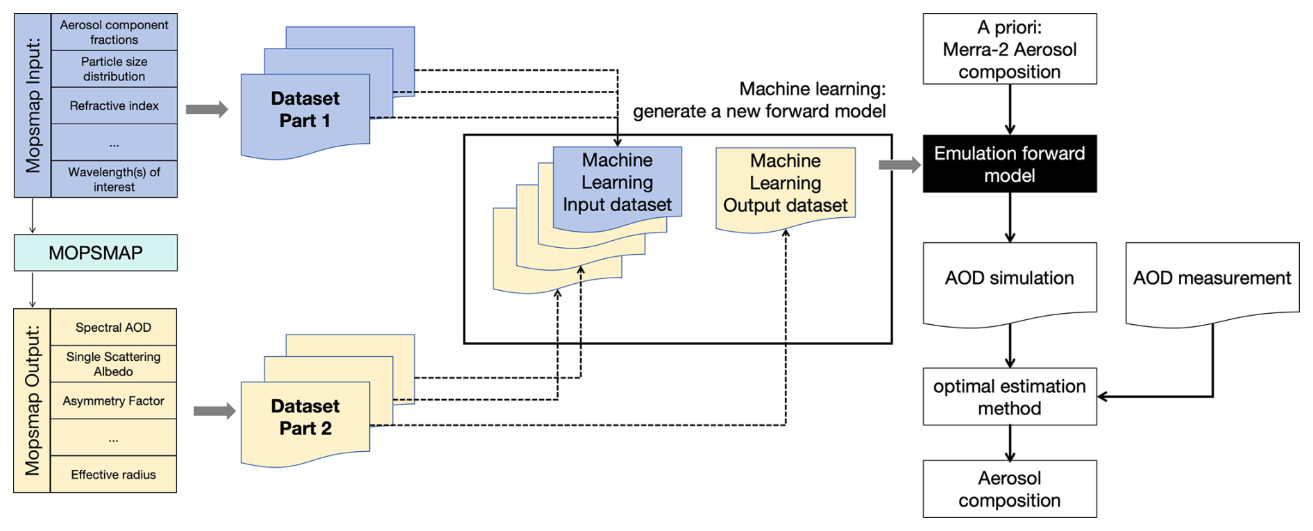 Figure 1Schematic overview of the model development and retrieval workflow. Left panel: MOPSMAP is used to generate a synthetic database by simulating optical properties from randomly sampled aerosol parameters, including component fractions, size distribution, and refractive index. Based on the subset of optical parameters that are typically available in real observations (e.g. SSA, AF, and Reff), we reorganize the simulated database to define the machine learning inputs. The corresponding aerosol component fractions, SSA, AF, and Reff are selected as the machine learning inputs. The spectral AOD is the machine learning output. This effectively inverts the original MOPSMAP input-output structure to train an efficient, observation-driven emulator of the forward model. Right panel: The trained ML-based forward model is then used within an optimal estimation framework. Prior aerosol composition is taken from MERRA-2 (Gelaro et al.2017), and AOD is simulated using the learned forward model. By minimizing the mismatch with observed AOD measurements, the aerosol composition is retrieved. This setup allows flexible integration of real-world measurements and efficient inversion without full-physics simulation during retrieval.