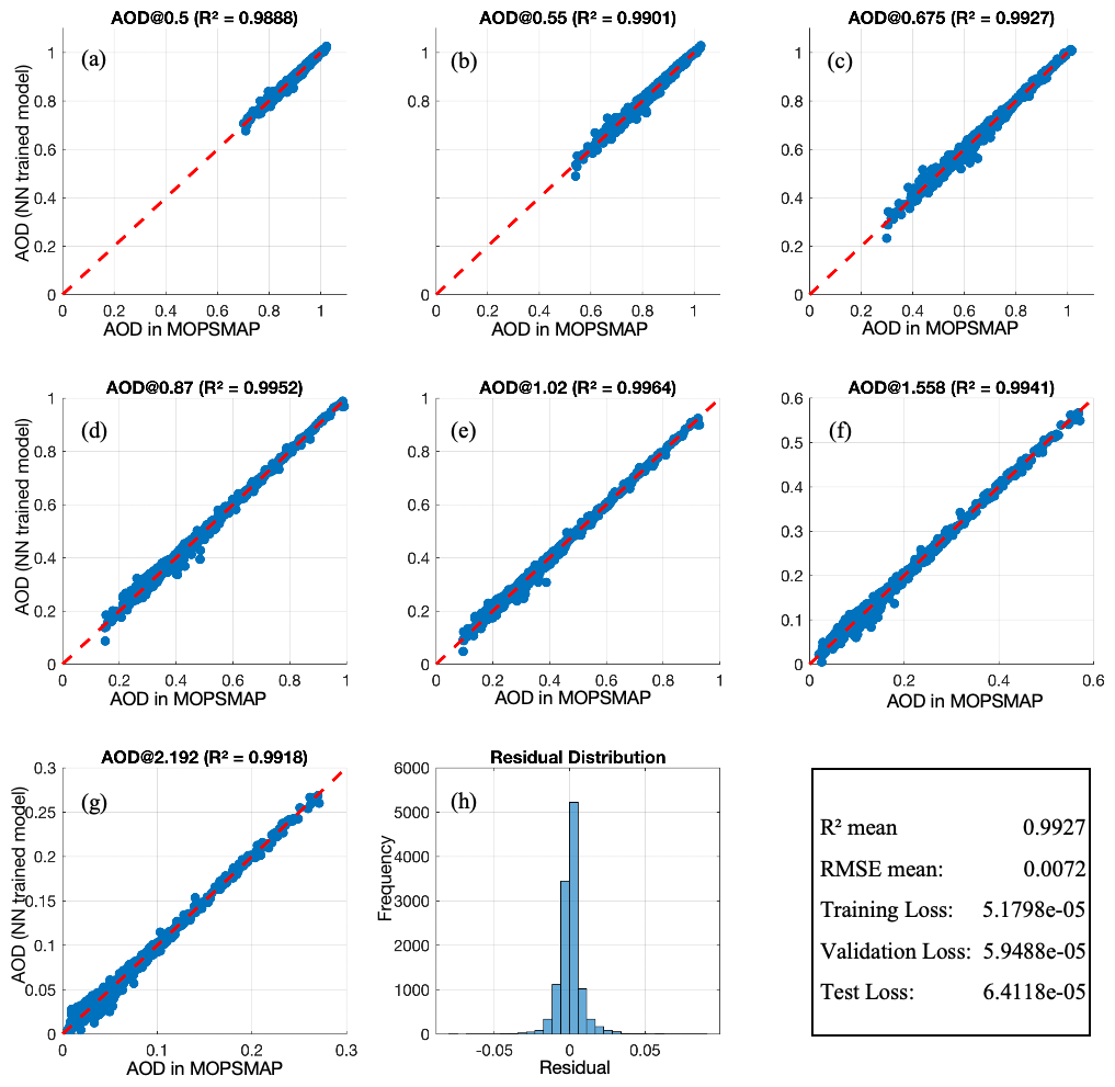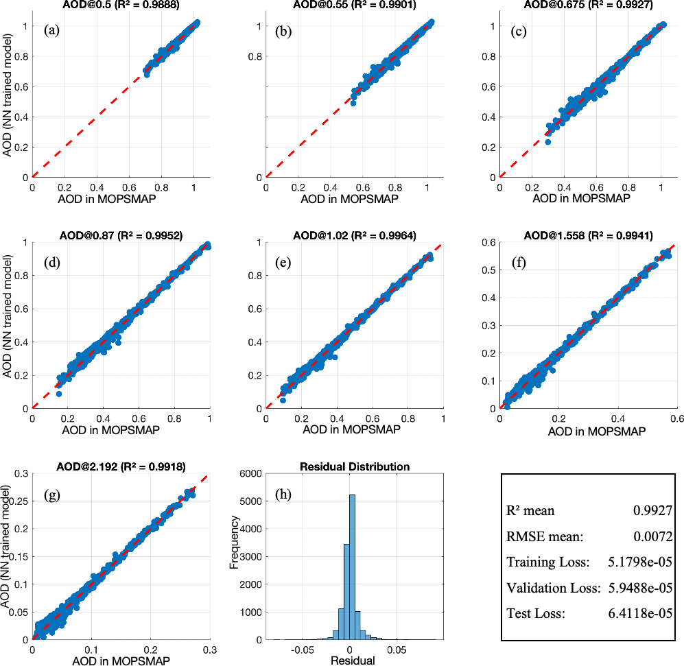 The input features consist of 5 aerosol component fractions (sea salt, sulfate, black carbon, dust, and insoluble), along with 4 physically-constrained parameters: SSA, AF, Reff, and RH. The output labels are the corresponding AODs at eight wavelengths: 440, 500, 550, 675, 870, 1020, 1558, and 2192 nm. We adopt a fully connected feed-forward neural network with two hidden layers, which is commonly used in aerosol retrieval studies (Faure et al.2001; Nanda et al.2019; Chen et al.2022). The architecture is defined as: