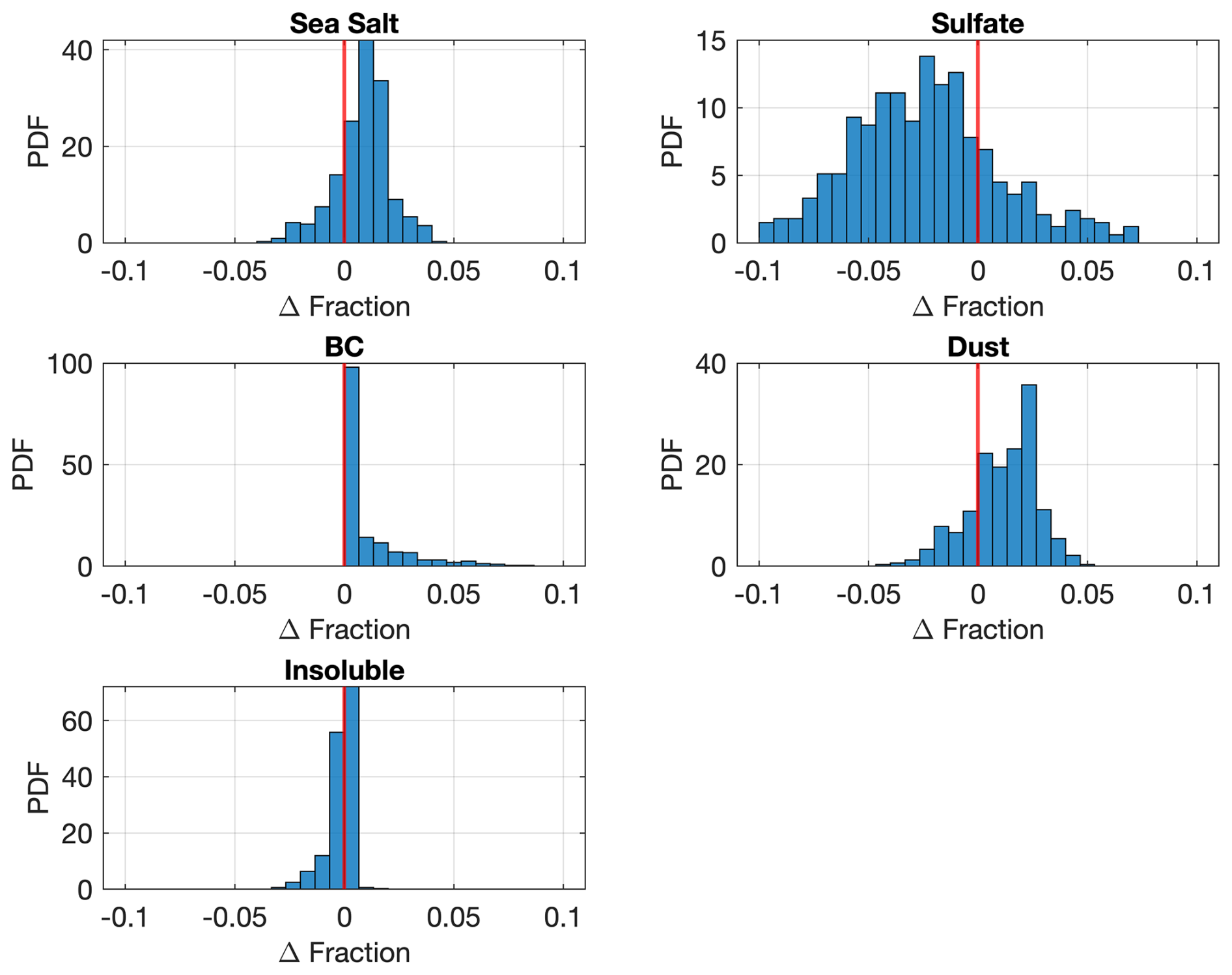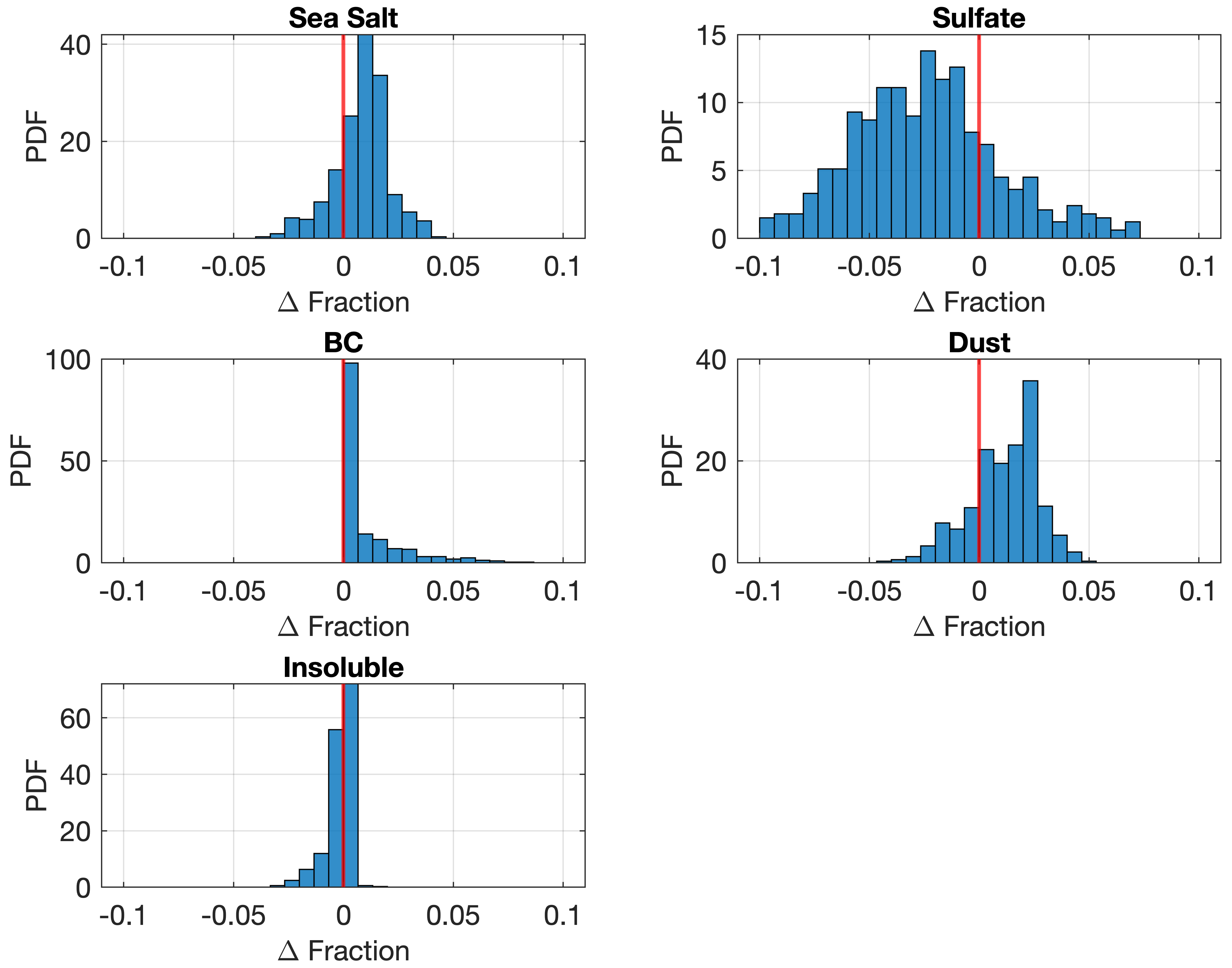 As given in Table 1, using MOPSMAP, we simulate 10 000 cases, obtaining a set of aerosol optical properties across multiple wavelengths, including: Extinction coefficient at visible and shortwave infrared wavelengths (440, 550, 675, 870, 1020, 1558, 2192 nm), Single scattering albedo (SSA), Asymmetry factor (AF) and Effective radius (Reff). To focus on the spectral shape of AOD rather than absolute magnitude, we scale all wavelengths relative to the 440 nm value. This results in a relative AOD spectrum, with AOD (440 nm) set to 1.0 and all other wavelengths scaled accordingly. The retrieved outputs represent number concentration fractions of aerosol components. Then, in post-processing, these fractions can be combined with observed or modeled AOD magnitudes to calculate component-specific AODs. However, due to differences in size-dependent extinction efficiency among aerosol types, the AOD contribution of each component is not strictly proportional to number fraction. Therefore, while the absolute AOD values of individual components may have some uncertainty, the spatial distribution and relative dominance of each aerosol type remain meaningful, particularly in high-AOD cases. The script used to generate this database is available in Section data and code.