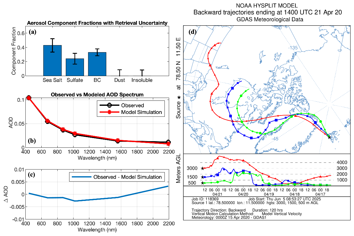 Aerosols play an important role in the climate system by influencing the Earth's radiation budget (Kuniyal and Guleria2019; Haywood2021), cloud microphysics (Mauritsen et al.2011; Gong et al.2023), and air quality (Garrett and Zhao2006). Depending on their properties, aerosols can either cool the Earth's surface by reflecting incoming solar radiation (Charlson and Wigley1994; Chang et al.2022), or warm the atmosphere by absorbing sunlight (Weinbruch et al.2012; Bond et al.2013; Breider et al.2014; Groot Zwaaftink et al.2016; Kodros2018). While the net global effect of aerosols is cooling, their climatic impact varies significantly with aerosol type, spatial distribution, and environmental conditions (Kaufman et al.2002; Satheesh and Moorthy2005). For example, strongly scattering aerosols such as sulfate and sea salt typically have a cooling effect in lower-latitude regions. However, in the Arctic, sea salt aerosols can undergo hygroscopic growth under Arctic humidity, which enhances their infrared radiative properties (Ji et al.2025) and potentially contributes to the longwave cloud radiative effects (Gong et al.2023). These complexities highlight the importance of accurately observing aerosol microphysical and optical properties in different environmental conditions to better quantify the impact of aerosols on climate and improve the performance of climate models.