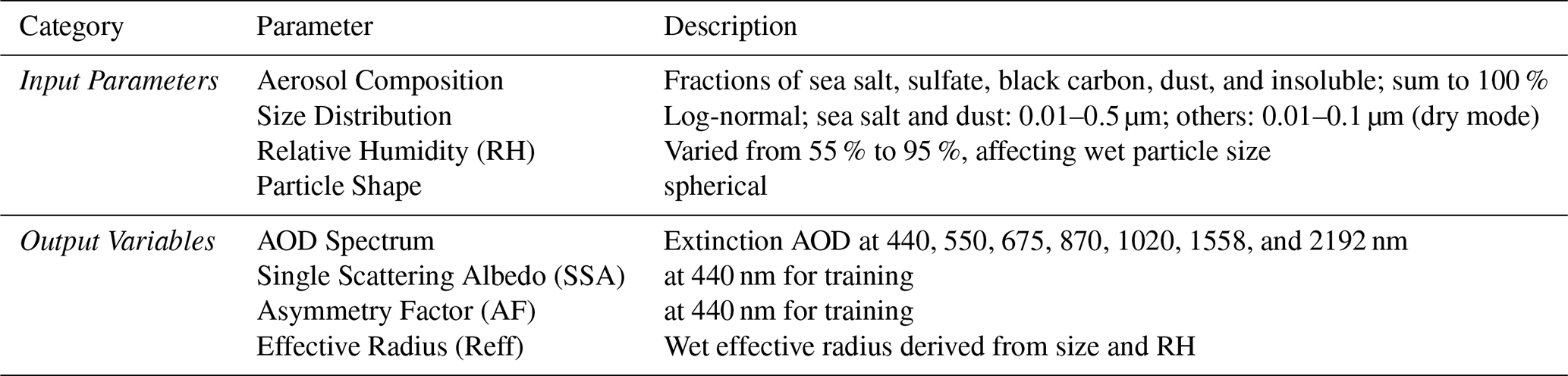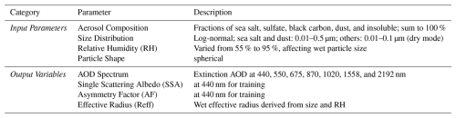 Table 1Overview of input parameters and simulated outputs used in the MOPSMAP-based aerosol optical property database.