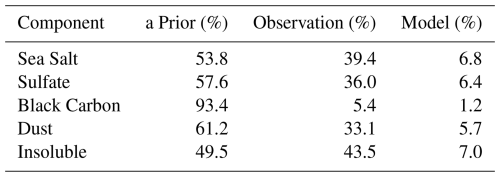 Here, Sa is the a prior covariance matrix, and Sy is the observation error covariance derived from AOD measurement uncertainty. The a prior vector xa is derived from the MERRA-2 monthly mean aerosol component fractions at the same time and location as the FTIR observations. The a priori covariance matrix Sa is specified as a diagonal matrix. For the synthetic (virtual-spectrum) experiments, a uniform variance of 0.01 (i.e., a standard deviation of 0.1) is prescribed for each aerosol component. For retrievals using actual observations, the diagonal elements of Sa are derived empirically from the spatial variability of MERRA-2 aerosol component fractions within a ± 1° latitude–longitude box centered on the observation location, and are used as aprior uncertainties. For the measurement error covariance matrix Sy, we distinguish between visible and shortwave infrared (SWIR) wavelengths. For visible bands, we adopt wavelength-dependent AOD uncertainties following AERONET direct-Sun uncertainty estimates, with a standard deviation of 0.02 at 440 nm and shorter wavelengths, and 0.01 at longer visible wavelengths. For the infrared bands (SWIR), we adopt 0.02 as the standard deviation, based on reported uncertainties from Barreto et al. (2020) and Alvárez et al. (2023), who applied Langley calibration for FTIR-based AOD measurements in the SWIR region. All uncertainties are assumed to be spectrally uncorrelated.