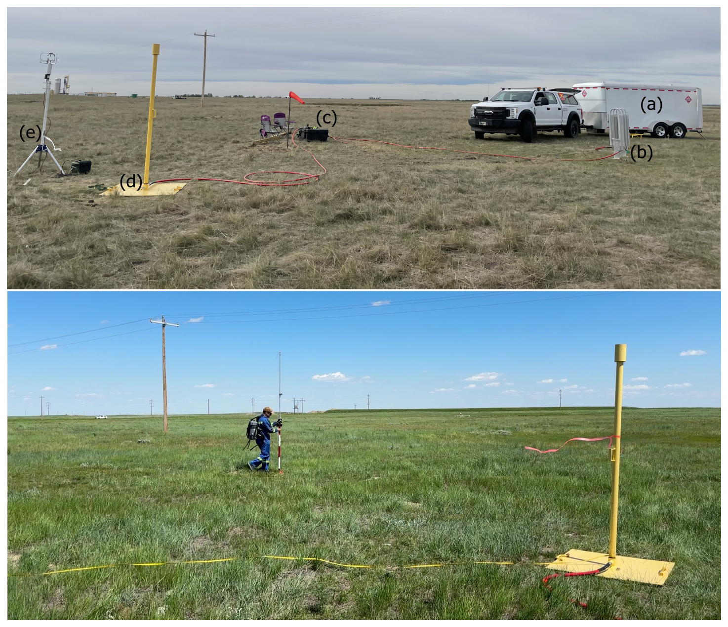 Figure 1Top panel – Controlled release setup. (a) CNG trailer with tanks. (b) ambient heat exchanger. (c) flow controller. (d) release stack. (e) anemometer. Bottom panel – the pole-based measurement system in operation during a controlled release test on 12 June 2024. The operator carried a CH4 sensor in a backpack harness and a long length of hose was run from the sensor's inlet to the end of the pole where air was drawn in. Photo credits Zhenyu Xing and Chris Hugenholtz.