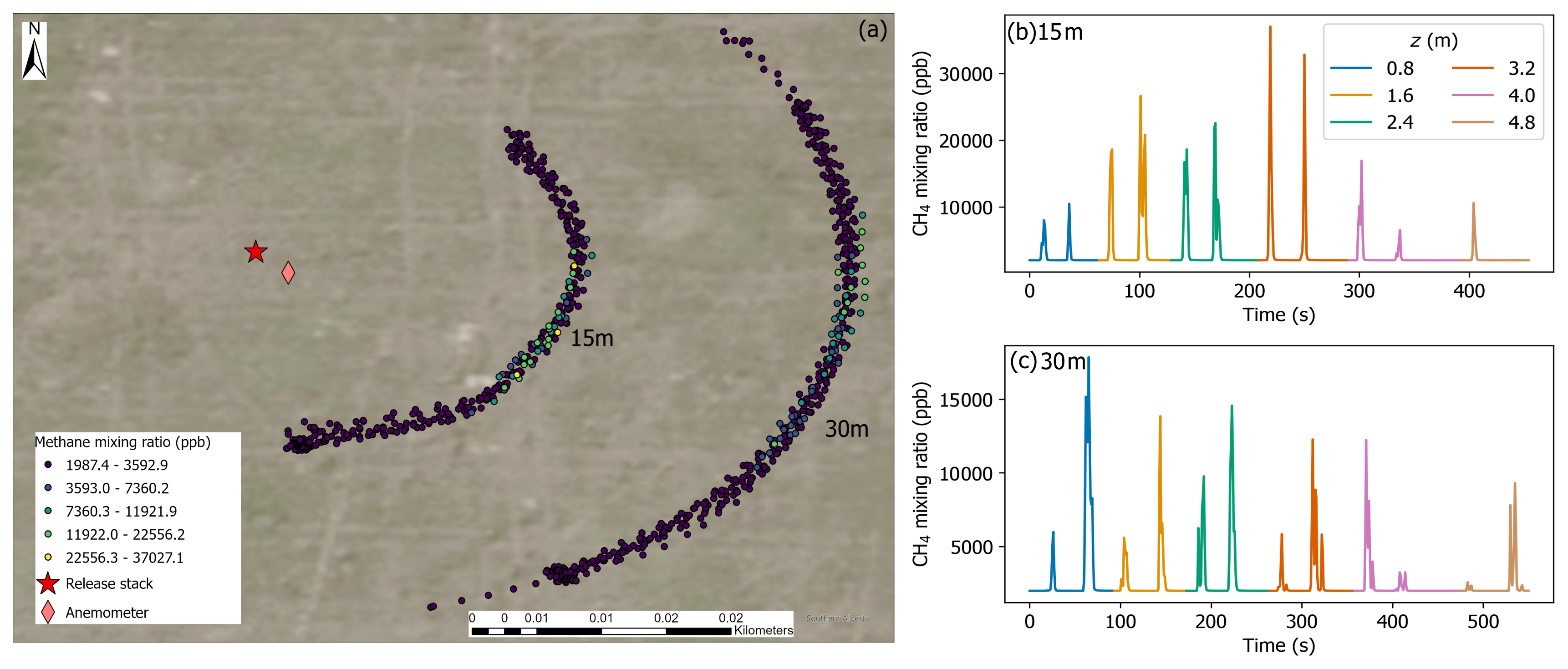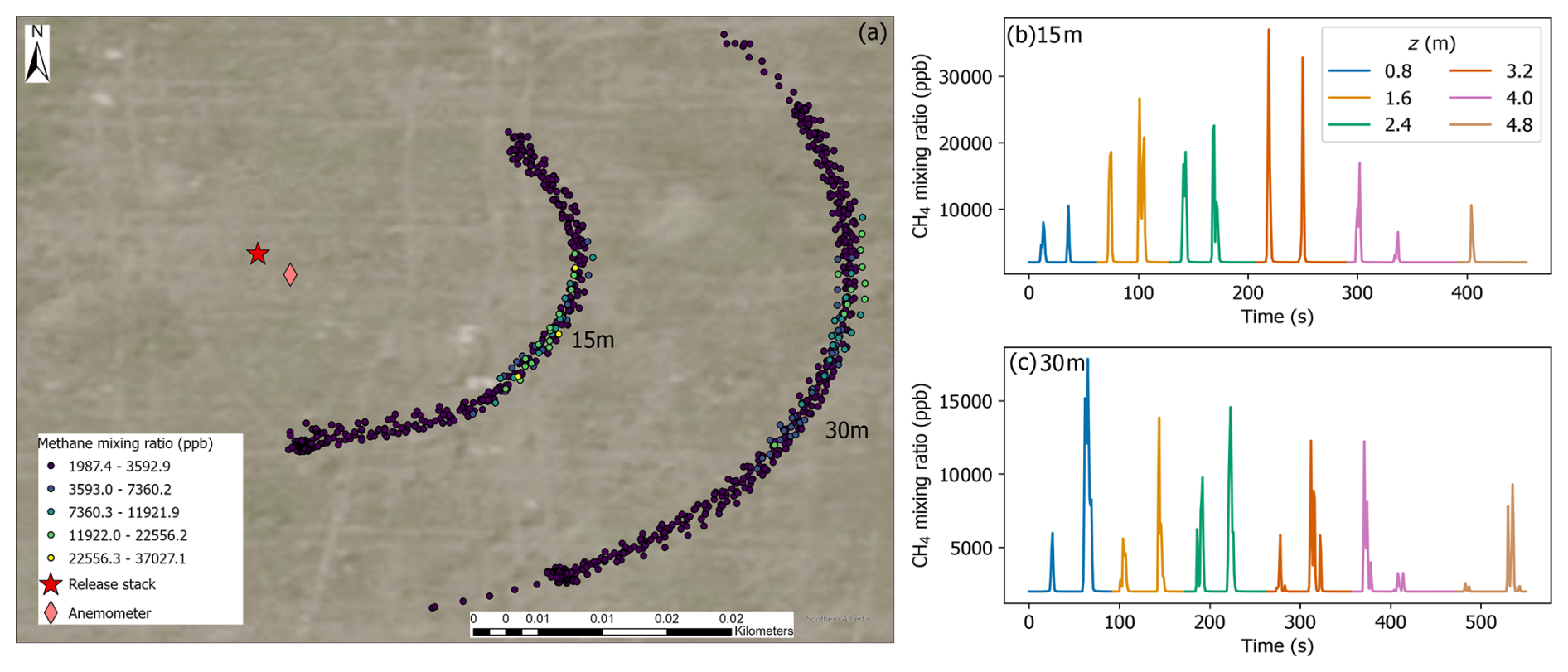 Figure 2(a) Arc transects walked with the backpack-mounted CH4 sensor and telescoping pole at 15 and 30 m downwind of the controlled release stack during a release of 2.4 kg CH4 h−1 on 12 June 2024. Circle colors correspond to CH4 mixing ratios in the legend. (b) and (c) CH4 mixing ratios by measurement height during the experiments at 15 and 30 m downwind distances. The legend in (b) corresponds to measurement height by color in (b) and (c). Each group of two peaks corresponds to two passes of the plume at a single measurement level. Low or no visible enhancements towards the end of the experiments at higher measurement heights suggests the highest measurement heights captured the vertical extent of the plume.