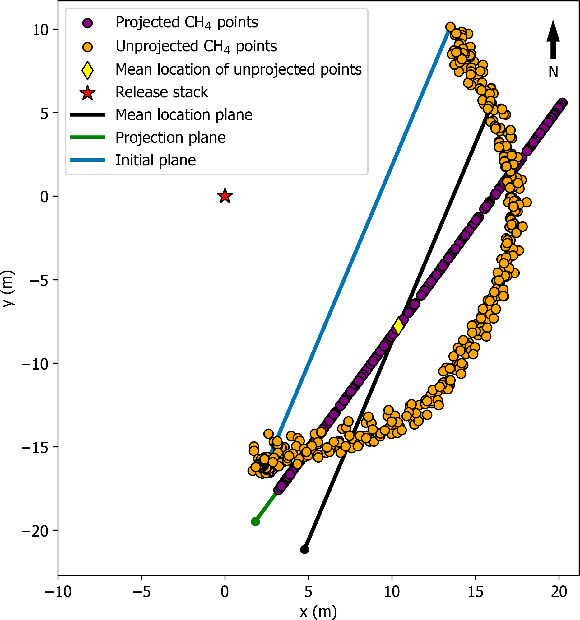 The flux plane method involves projecting the downwind CH4 measurements onto a two-dimensional plane oriented perpendicular to the wind direction. CH4 molecules are assumed to be advected through the plane by the wind. This simulates a crosswind slice of the plume and addresses potential issues with “off-axis” CH4 measurements, which could distort the plume's shape and thus affect the estimated flux. There is, however, limited guidance in the research literature on determining the horizontal extent of the flux plane (Nathan et al., 2015; Rella et al., 2015; Corbett and Smith, 2022). Therefore, after preprocessing the data, we defined the horizontal extent of our flux plane as the distance between the maximum and minimum (x, y) measurement locations (orange points Fig. 3), such that relative to the wind direction, the flux plane is initially situated in front of most measurement points downwind (blue line in Fig. 3). We then adjusted the position of the flux plane using the average of the measurement locations (yellow diamond Fig. 3) as the plane's (black line Fig. 3) midpoint, as this minimizes the projection distance for the points onto the two-dimensional plane (Nathan et al., 2015). Higher data density at the starting point of the arc transects – due to the operator adjusting the height of the pole at this location after each set of two consecutive plume passes – may have influenced the point's location and is an area for method improvement. We rotated the plane to be perpendicular (green line Fig. 3) to the reference wind direction/plume centerline, which we defined as the angle between the release stack and the peak CH4 location in each experiment (Caulton et al., 2018).