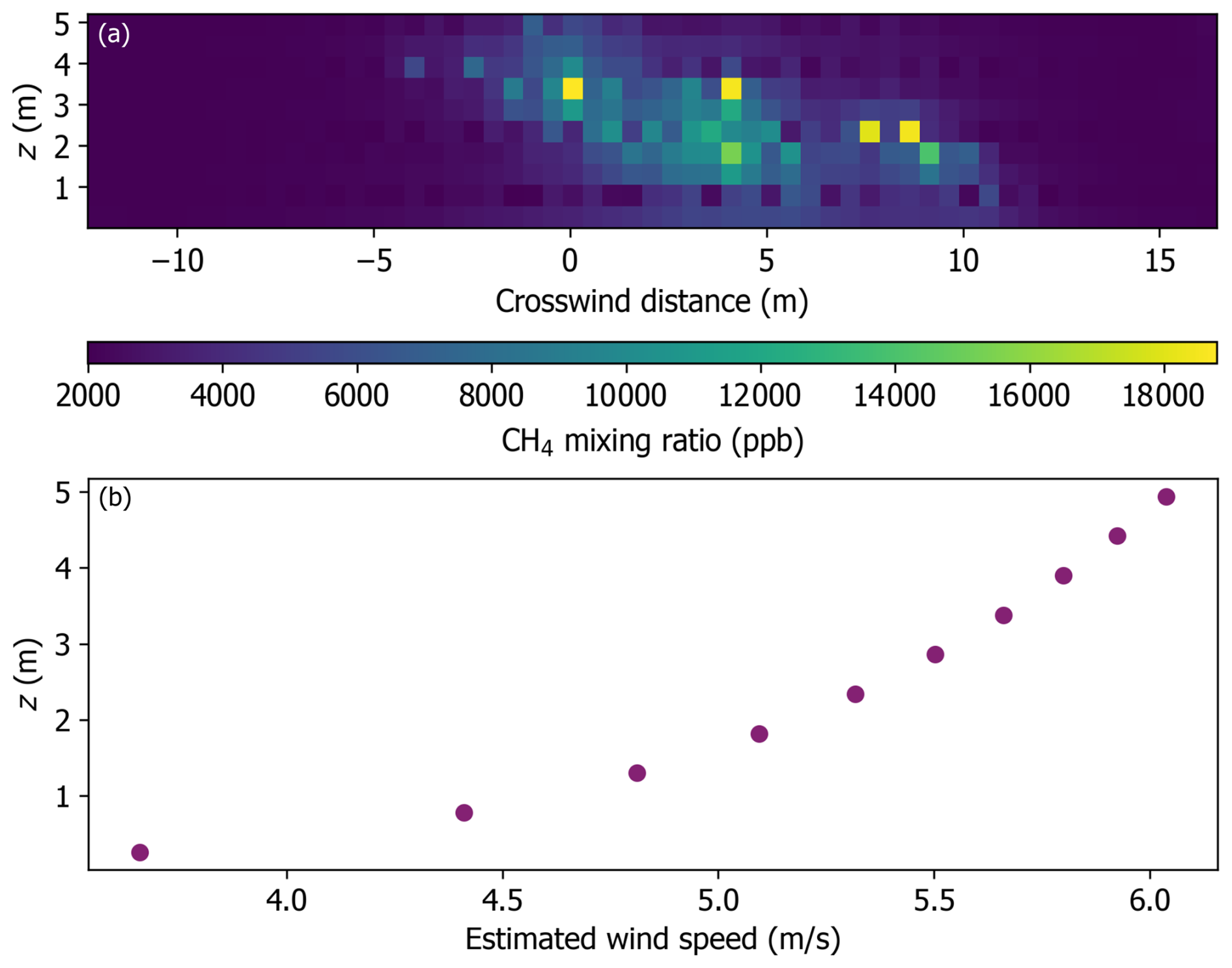 We measured wind speed at a height of 2.2 m during the experiments. As such, it was necessary to extrapolate the wind speed measured at this height to match the heights of the interpolated CH4 mixing ratios for emissions quantification. A power law (Heier, 2014) was used to estimate wind speed for grid cell centers: