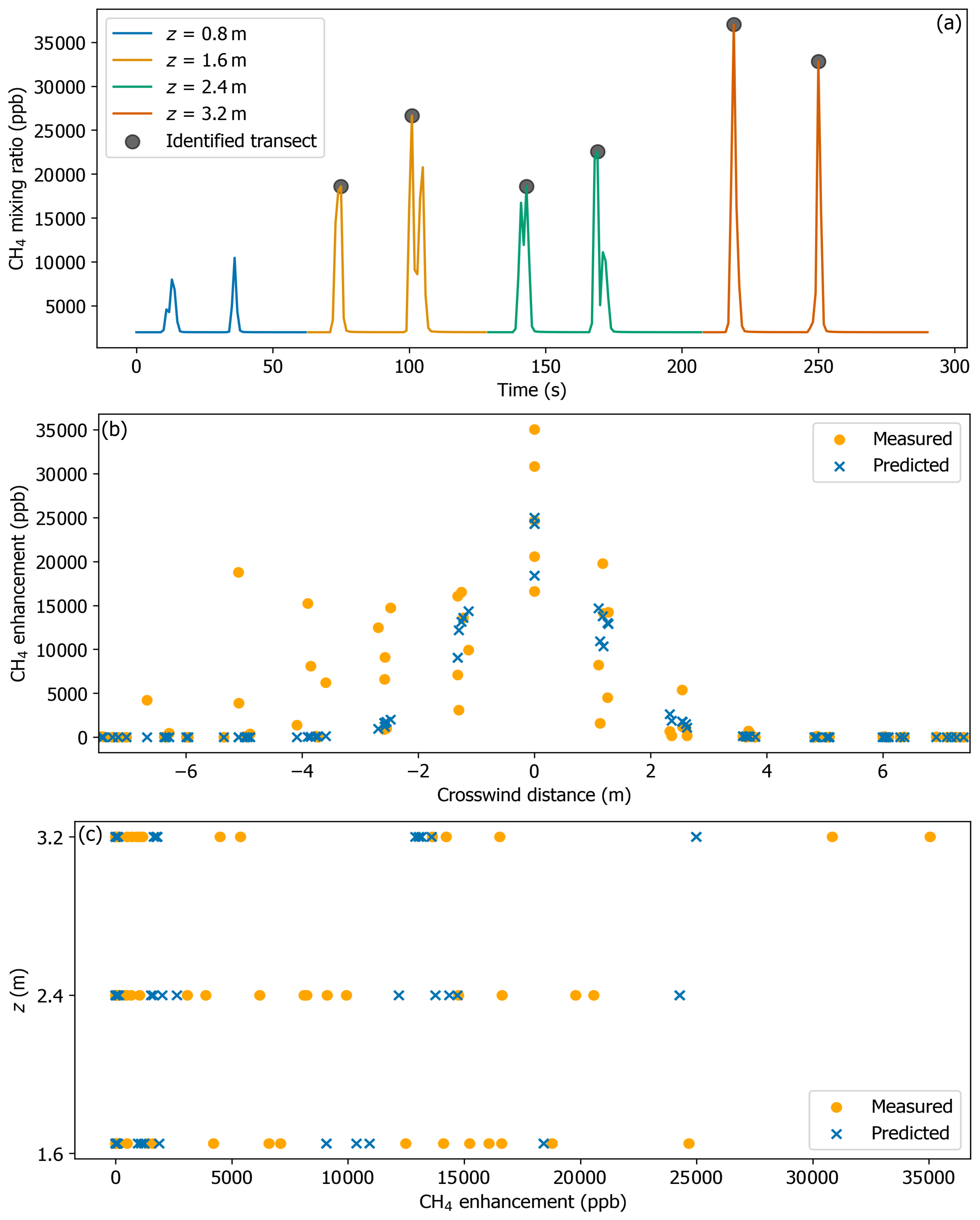 Figure 5a shows the 2.4 kg CH4 h−1 release at 15 m downwind where the peak CH4 mixing ratio was measured at an altitude of 3.2 m; removing the top two measurement levels in this experiment simulated a situation where only the bottom part of the plume was measured.