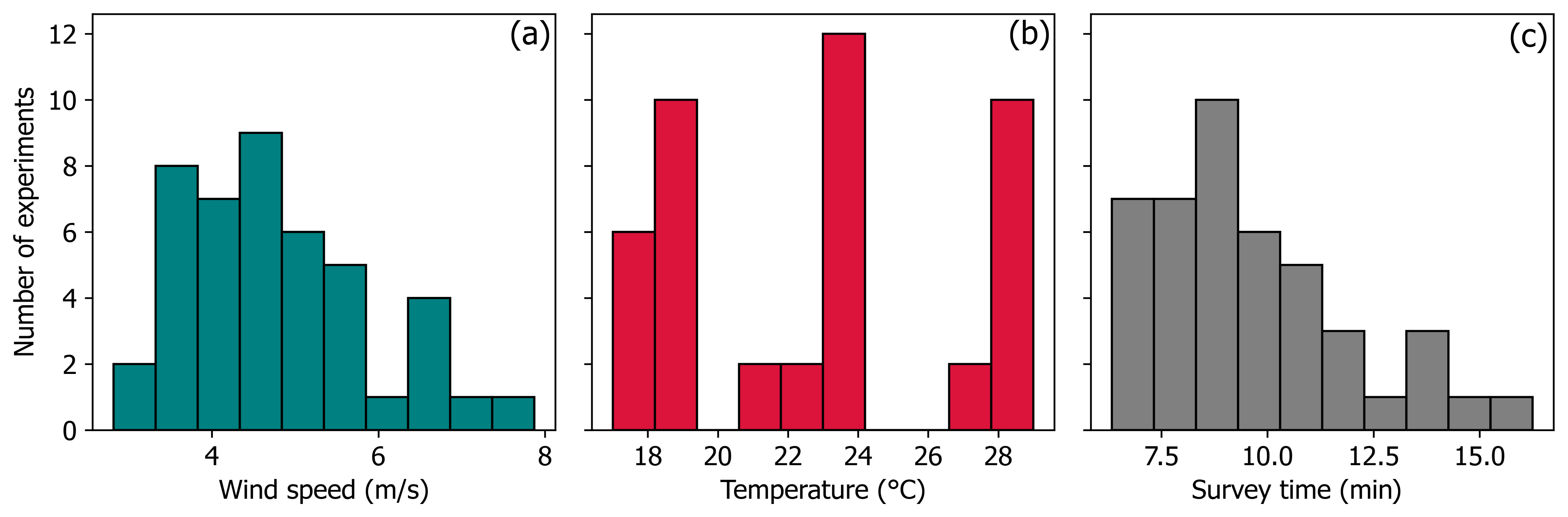 Wind speeds across the 44 controlled release experiments on the 11, 12 June and 6 August 2024 averaged 4.8 m s−1. Minimum wind speed was 2.8 m s−1 and maximum wind speed was 7.9 m s−1 (Fig. 6a). Mean wind speeds were <3 m s−1 in two (4.5 %) out of the 44 individual experiments; wind speeds were generally between 4 and 6 m s−1 in the majority of experiments. The experiments were performed over a wide range of temperatures (16.8 to 29 °C) with a mean of 22.9 °C (Fig. 6b). The lack of continuity of the data in Fig. 6b reflects the different temperatures on each testing day. The 6 August 2024 had the lowest temperatures while the 11 June 2024 had the highest temperatures. The total number of experiments performed under the Briggs stability classes of B, C, and D were 2 (4.5 %), 12 (27.3 %), and 30 (68.2 %), respectively. The mean survey time to complete the pole-based transects in the experiments was 9 min 35 s, varying from 6 min 20 s for closer downwind distances to 16 min 15 s for farther downwind distances (Fig. 6c).