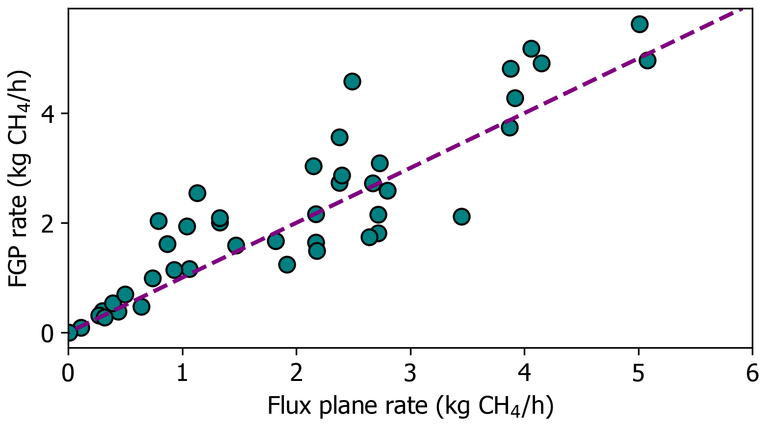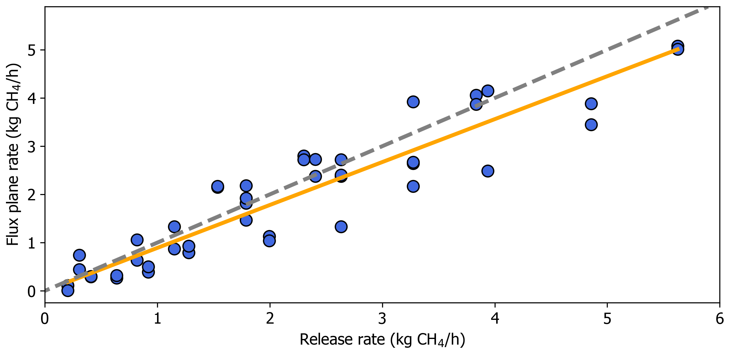Figure 7Ordinary Least Squares (OLS) regression of flux plane estimated CH4 emissions rates on the release rates. The orange line shows the model fit and the grey dashed line is 1:1.
