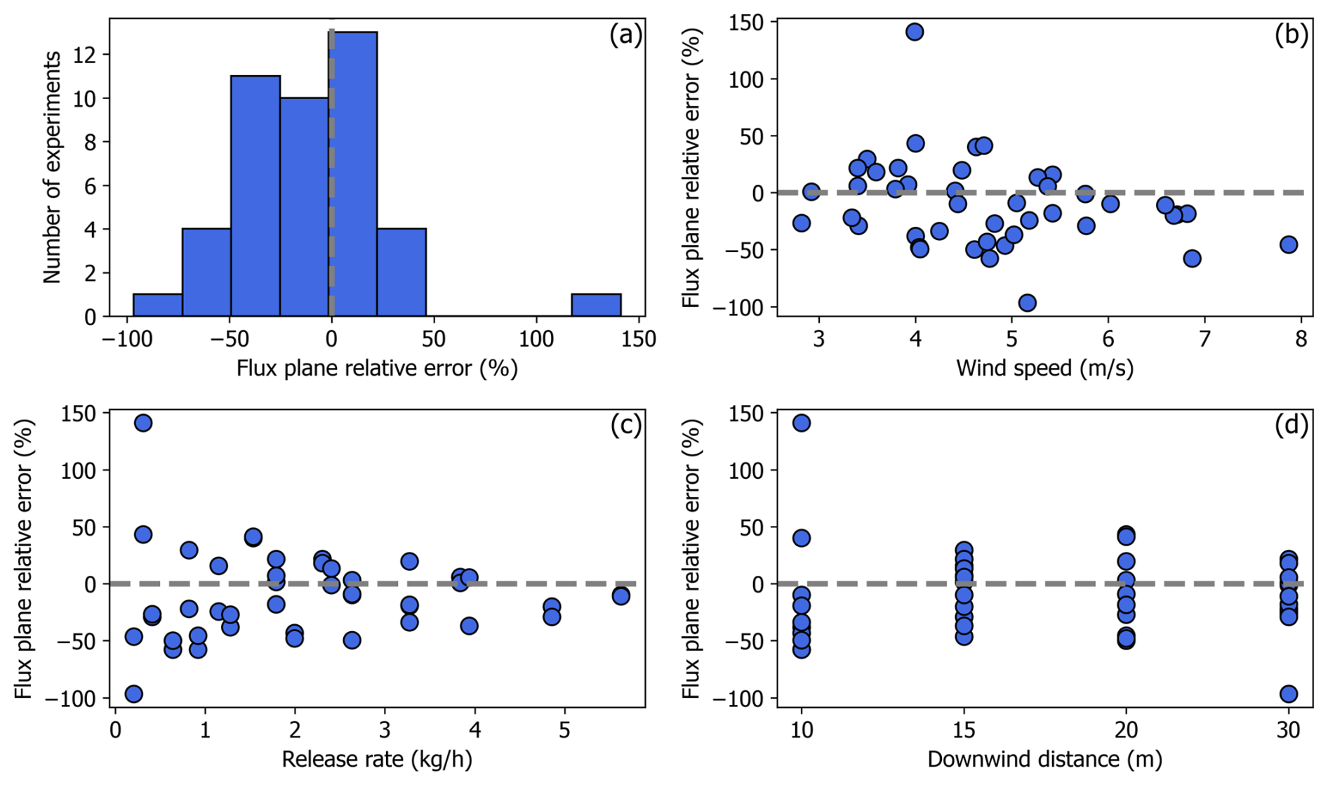 Figure 8(a) Percent relative error distribution of the CH4 release rates quantified with the flux plane method. (b, c, d) Percent relative error as a function of wind speed, release rate, and downwind measurement distance, respectively.