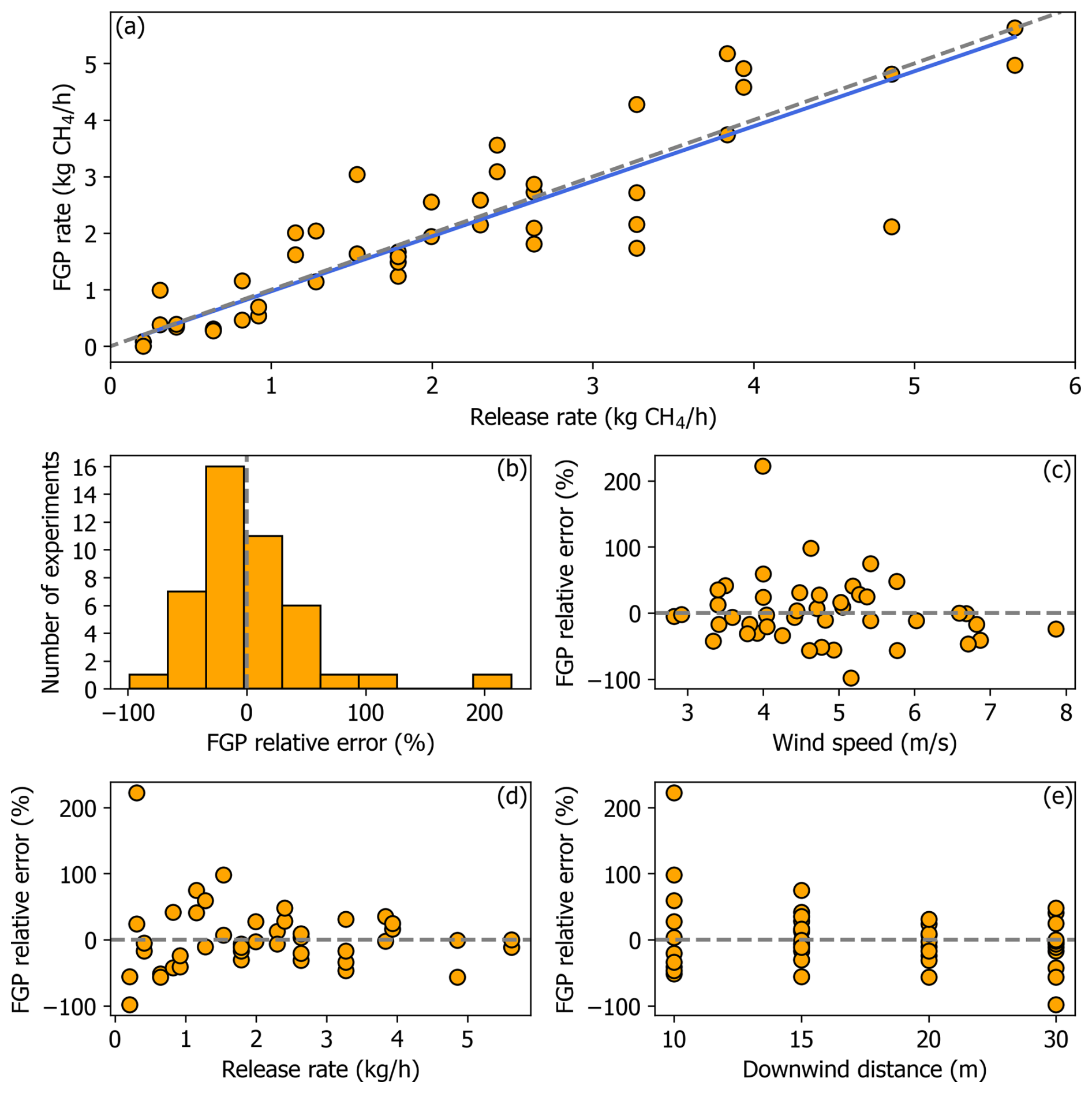 Figure 9(a) Ordinary Least Squares (OLS) regression of optimized forward Gaussian plume (FGP) model estimated CH4 emissions rates on the release rates. The blue line shows the model fit and the grey dashed line is 1:1. (b) Percent relative error distribution of the CH4 release rates quantified with the forward Gaussian optimization method. (c, d, e) Percent relative error as a function of wind speed, release rate, and downwind measurement distance, respectively.