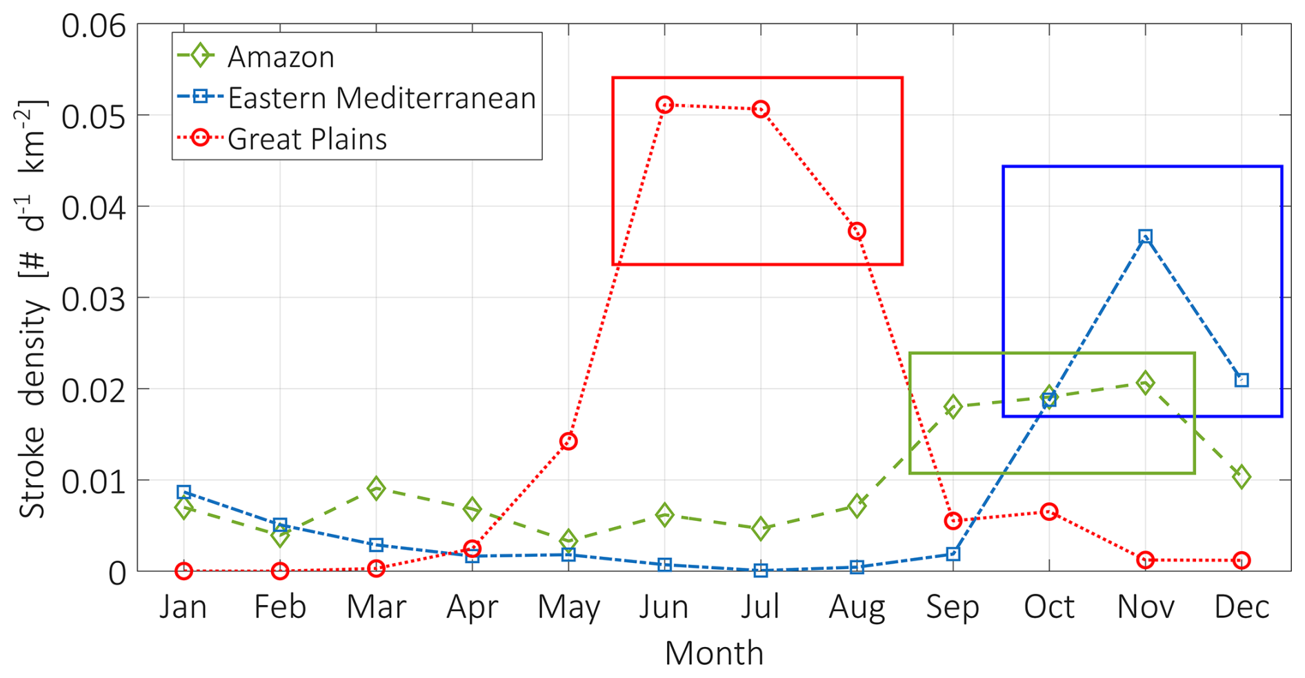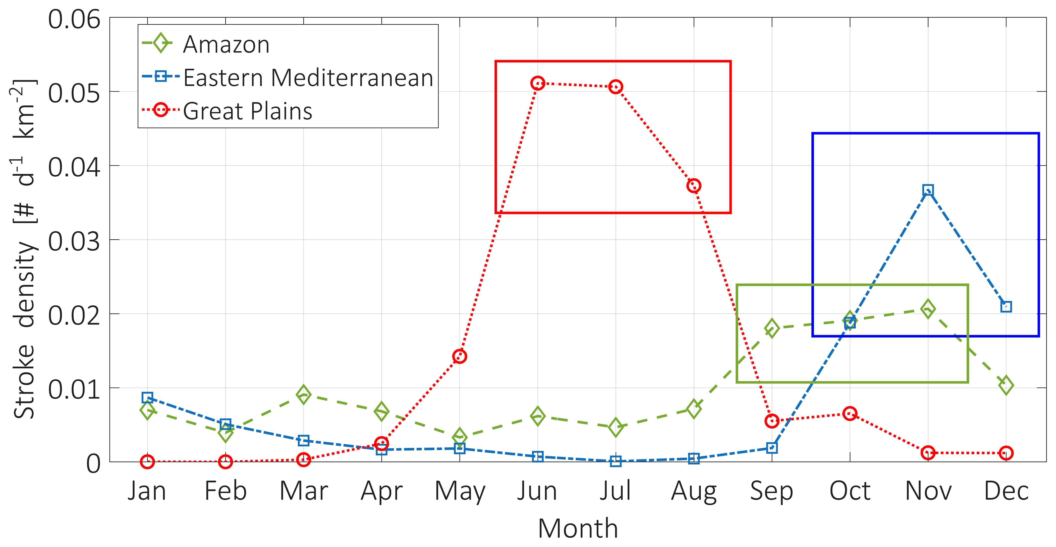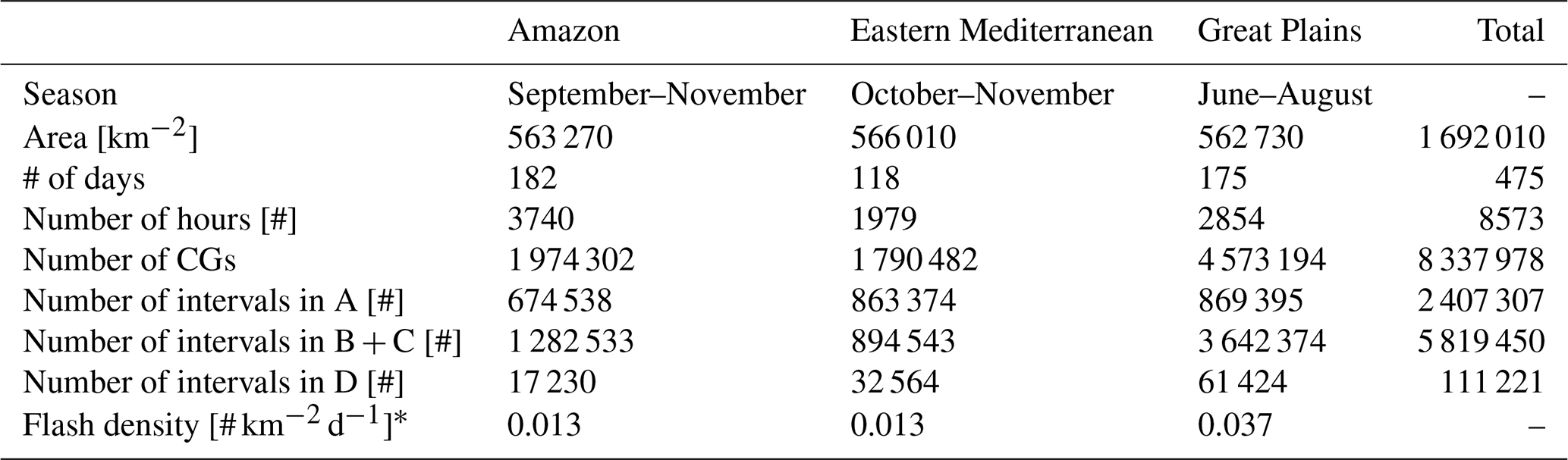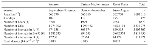 In this study, we use CG stroke data. For each ROI, we focus on the specific season with the highest stroke density within 2020–2021 (Fig. 2, Table 1), ensuring that the LDS analysis is based on a large and representative sample of CG activity for each region. The total analyzed dataset includes 8 337 978 strokes, detected over 182 d in the Amazon, 118 d in the Eastern Mediterranean, and 175 d in the Great Plains during the selected seasons.