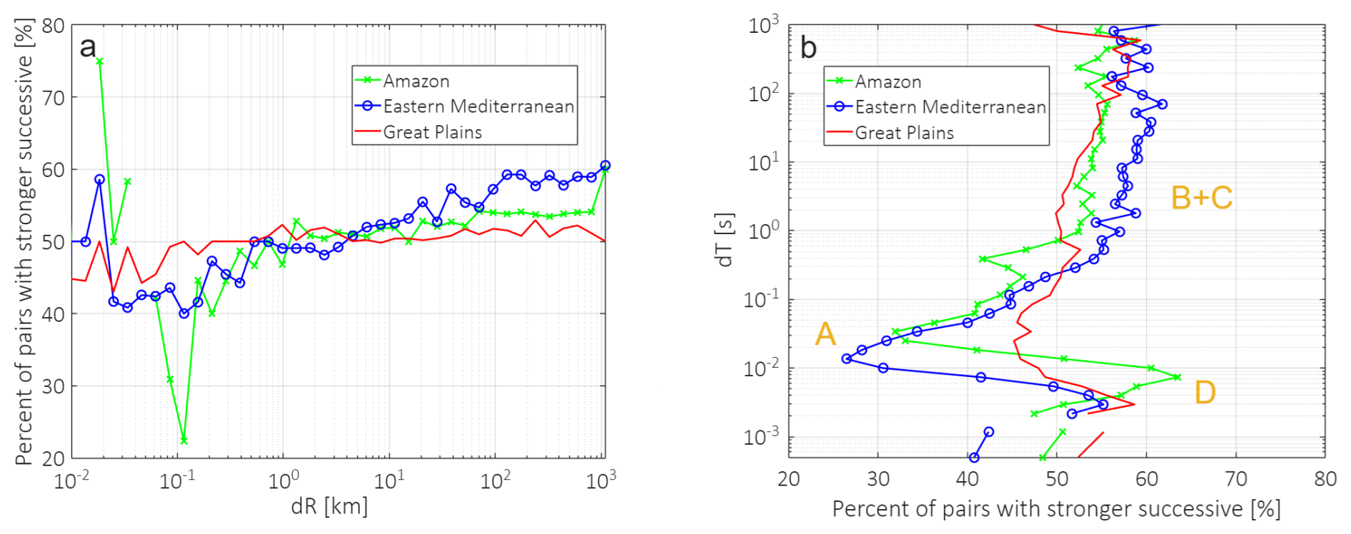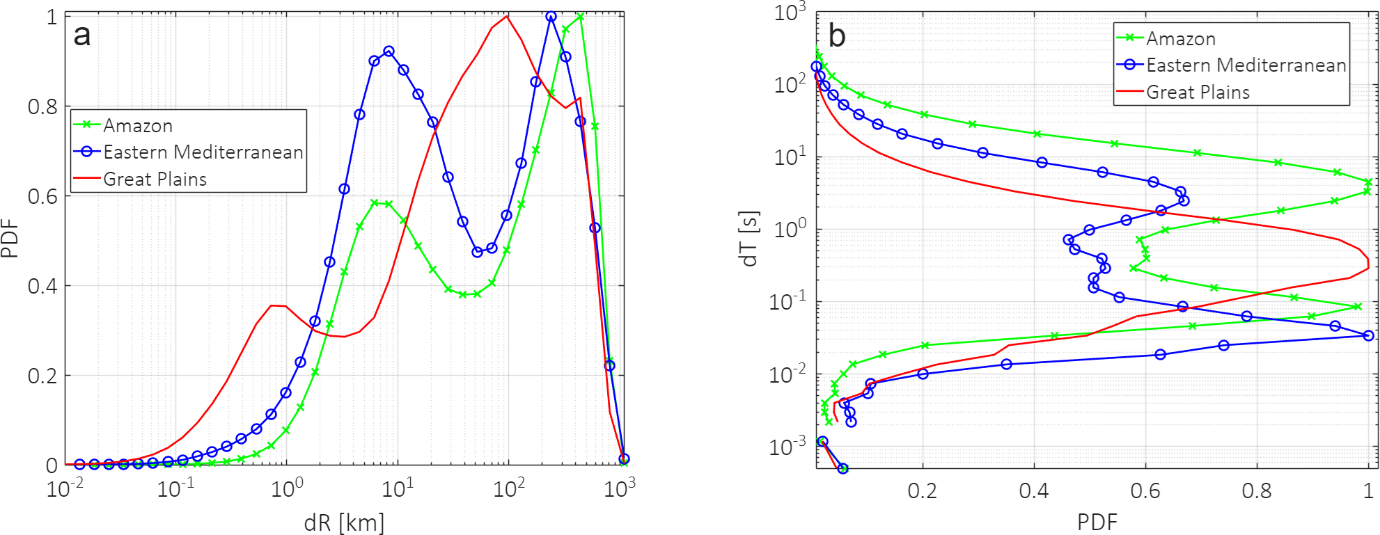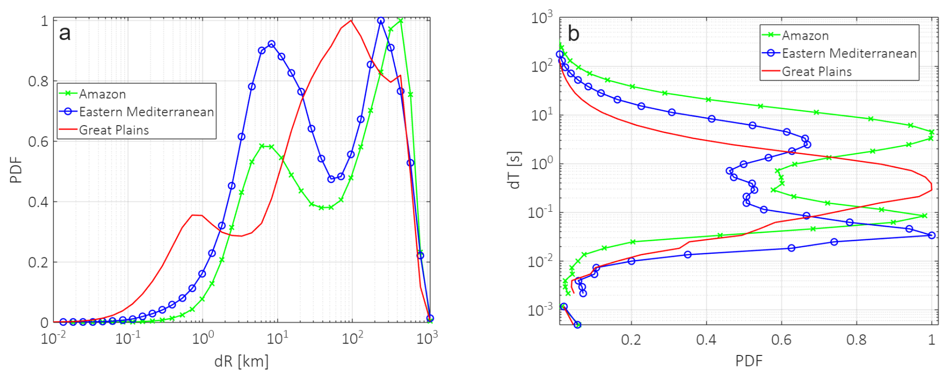 Figure 4 shows the projection of the PDFs (from Fig. 3) onto the dR (X) and dT (Y) axes. The projection on the dT axis (Fig. 4b) clarifies that in the Great Plains, there is no temporal separation between clusters A and C, i.e., between events occurring at the cloud scale and at the cloud-system scale. This contrasts with the well-defined temporal separation between clusters A and C observed in the other two regions, the Eastern Mediterranean and the Amazon. This lack of separation, together with the relatively shorter dTs of cluster C (between ∼ 0.1–2.4 s), is consistent with the higher CAPE values and deeper clouds in the Great Plains, which support stronger updrafts and enhanced charge separation, leading to shorter stroke-to-stroke intervals. It is also reflected in the high flash density in this region (0.037 km−2 d−1, Table 1), about three times greater than the flash density in the Eastern Mediterranean and the Amazon (0.013 km−2 d−1, Table 1). This finding is supported by Kastman et al. (2017), who report a high CG flash rate for a certain type of MCSs passing over the Great Plains during this season. The elevated flash density in this region is likely related to the frequent occurrence of MCSs and other long-lived mesoscale systems, which are characterized by a high frequency of electrical events and hence shorter intervals between flashes.