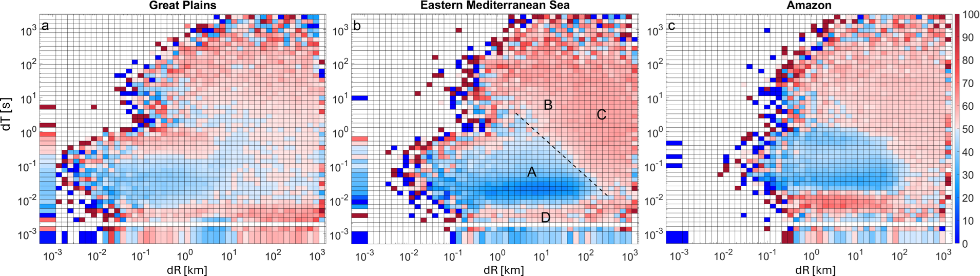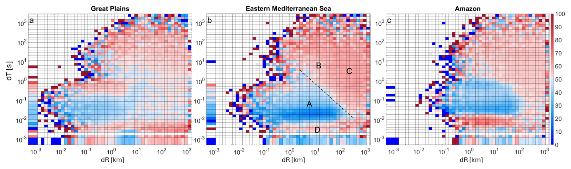 Figure 3Number Distribution LDS. PDF of the dR and dT intervals between consecutive strokes, normalized by the maximum, for (a) the Great Plains, (b) the Eastern Mediterranean, and (c) the Amazon. The locations of clusters A–D are illustrated in panel (b). Intervals with PDF < 0.025 are marked in gray.