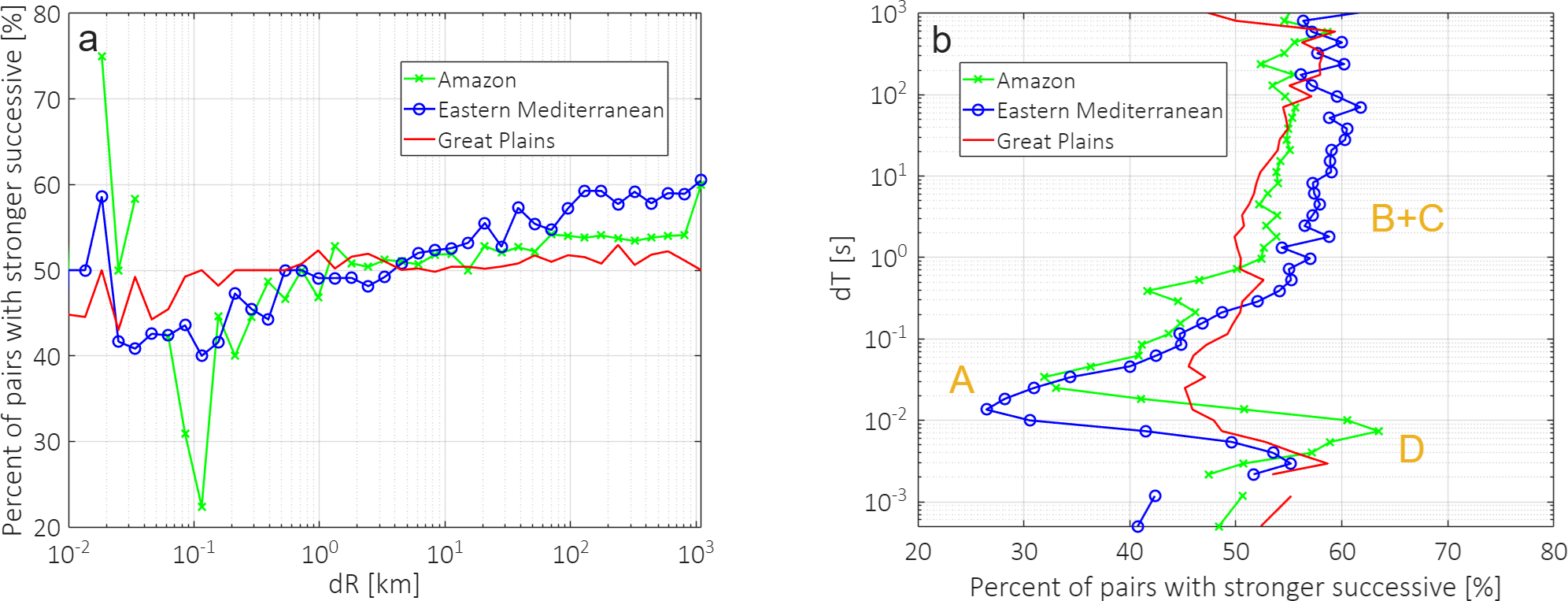 The high percentage of a stronger peak current of the 2nd stroke in a pair in cluster D (similar to clusters B and C, also marked in Fig. 6b) indicates that these stroke pairs are probably the initial strokes in flashes. However, cluster D spans a wide range of distances (dRs). For short distances, up to ten or a few tens of kilometers, it may indicate electrical events within the same thundercloud. It appears when a consecutive stroke in a multiple-stroke flash is more intense than the previous one, as expected for ∼ 30 % of flashes (Diendorfer et al., 2022). In this regard, it is notable that the clustering of such events occurs at shorter dTs than the typical inter-stroke dT intervals in cluster A. The part of cluster D that pertains to much longer dRs indicates electrical events involving two strokes that take place nearly simultaneously but at locations that are tens to hundreds of kilometers apart. Although the exact mechanism is yet to be elucidated, several processes have been proposed, suggesting that their nearly simultaneous occurrence is not a pure coincidence and that there is a physical mechanism that ties these remote strokes together. Füllekrug (1995), Ondrášková et al. (2008), and Yair et al. (2006) have suggested triggering by the Schumann resonance. Later, Yair et al. (2009a) proposed a theoretical model in which a lightning flash may enhance the electric field in neighboring cells as a function of the distance between them, potentially triggering a near-simultaneous flash in a remote (mature) thundercloud. Here, using only data from a lightning location network, we cannot confirm or rule out the lightning-triggering mechanisms that may explain the part of cluster D with longer dRs.