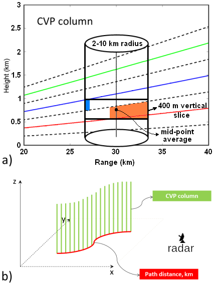 If the predefined path (red line in Fig. 1b) is a straight line centred at the radar location along the azimuth, pCVP becomes an RHI proxy along the chosen azimuth. However, the locations selected for CVP computations along the path can be arbitrary, so pCVP provides users the freedom to define it. One limitation in pCVP construction is the distance from the radar to the defined pCVP location. Here, radar beam geometry plays a crucial role in pCVP usability because the further the distance from the radar, the higher the radar beam is above the ground. Hence, computing pCVP locations at long ranges from the radar widens the gap between the bottom of the radar data profile and the ground. The beam geometry feature also appears as the gap in data between the radar elevations at longer distances from the radar (if the horizontal averaging radius (2–10 km) or the column vertical slice (400 m) is too small, adjacent elevations in the pCVP will not overlap). Finally, the increased sample volume at longer ranges due to beam broadening impacts radar's ability to identify small features. Additionally, note that the number of points used for vertical projection in Fig. 1a decreases with increasing height, which slightly reduces the statistical accuracy of the estimates as height increases. The path increments (distances between consecutive EVPs/CVPs locations – spaces between the green lines in Fig. 1b) are also arbitrary, depending on the pCVP purpose, and usually range between 100 m and 1 km.