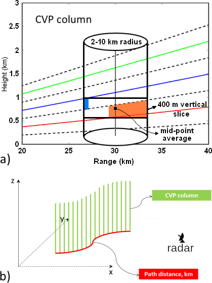 Figure 1(a) Enhanced/Column Vertical Profile (EVP/CVP) modified for pCVP with 2–10 km radius, centered at 30 km from radar location; red, blue, and green lines represent the three lowest radar elevations. The orange and light blue shades specify range gates that correspond to their color-coded elevations (red and blue), contributing to the vertical profile formation. The Cressman interpolation of the radar data collected from any elevation within the horizontal radius of 2–10 km and a 400 m vertical slice produces the data point (large black dot in the middle of the 400 m section) for the vertical profile; broken black lines are the top and bottom of the radar elevation; (b) construction of pCVP from EVP/CVP columns defined in panel (a): vertical green bars represent the individual EVP/CVP profiles stacked along the predefined path (red line) in arbitrary increments (usually 100 m–1 km). The radar icon represents the corresponding radar location.