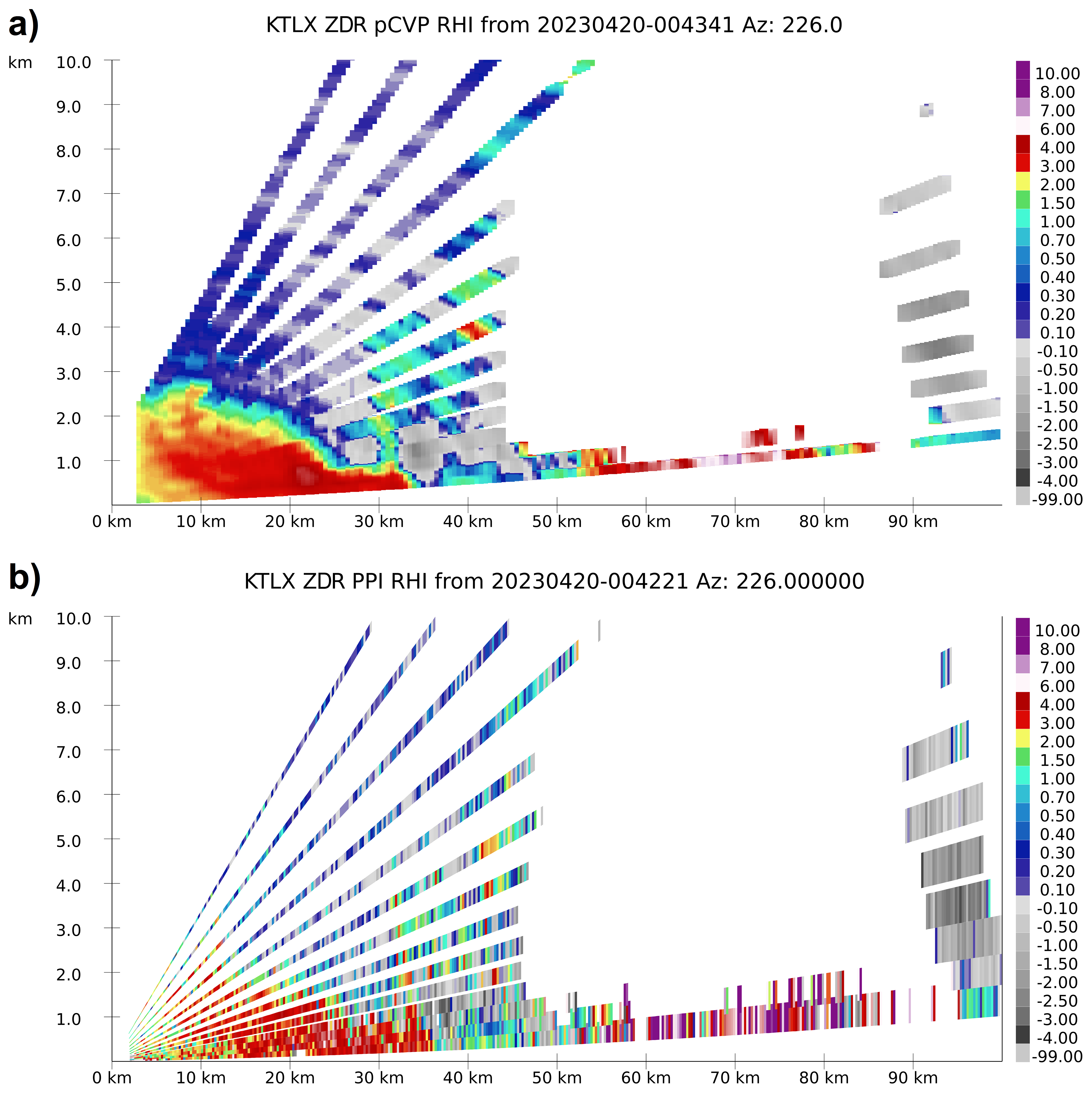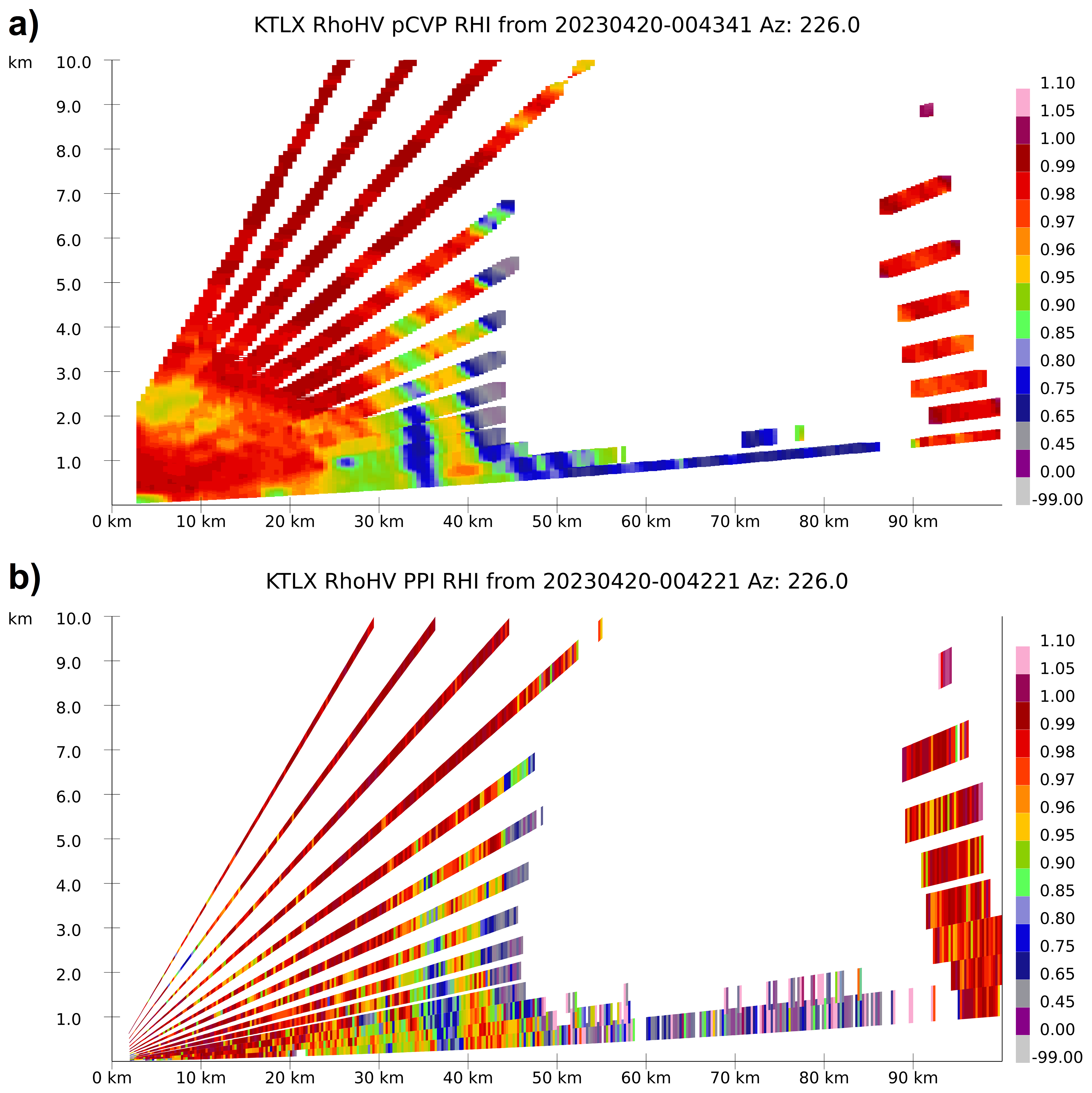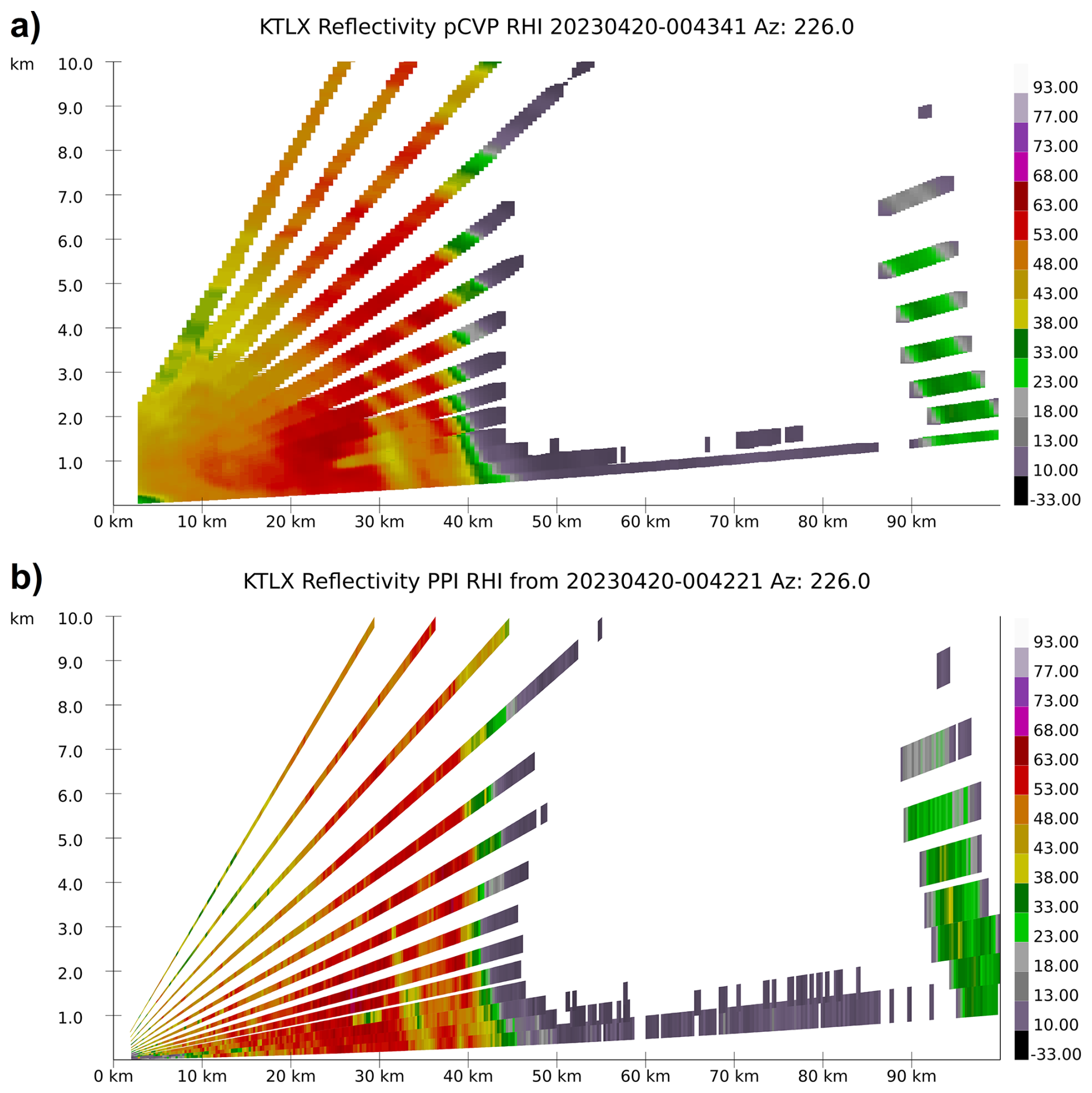 We present the case of an EF2 tornado observed by KTLX radar near Cole, OK, between 00:32 and 00:56 UTC on 20 April 2023. The estimated EF2 tornado at 00:44 UTC is located at ∼ 37.5 km from radar, as evidenced by the increase in Z (Fig. 2a, b) in the lower 0.5 km a.g.l., the reduction in ρhv throughout the column up to 3 km a.g.l. (Fig. 3b) and ZDR from 0.5 to 1.5 km a.g.l. (Fig. 4b). Except for the reflectivity field, whose magnitude is less pronounced in pCVP due to averaging, ρhv (Fig. 3a) and ZDR (Fig. 4a) look much cleaner and more pronounced at the tornado location. Another enhanced feature in pCVP in comparison to PPI-based RHIs is a bounded weak echo region (BWER) associated with the storm producing the tornado, a column of reduced reflectivity values stretching aloft to 3.5 km a.g.l., located at ∼ 35 km ground distance from the radar. The KTLX radar PPIs of Z (Fig. 5) from elevations 0.49, 1.29, 2.41, and 3.13° at ∼ 00:43 UTC provide additional confirmation that the aforementioned feature is BWER (the black line roughly represents the tornado path). The reduction of Z associated with BWER is easily visible at (x,y) = ∼ (−25 km, −25 km) in all four elevation PPIs (Fig. 5).