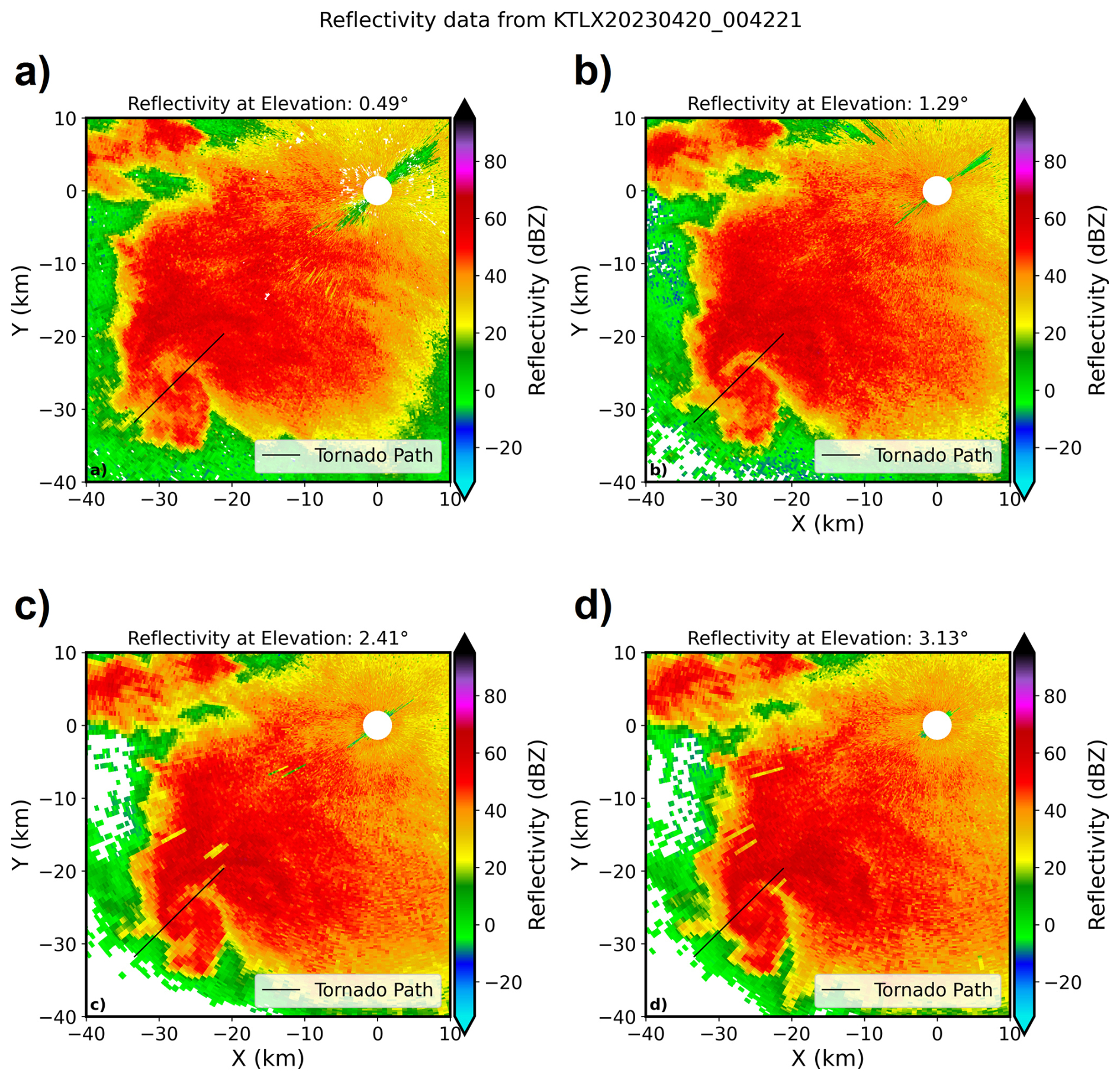 Figure 5PPIs of Z from KTLX radar at elevations (a) 0.49°, (b) 1.29°, (c) 2.41°, and (d) 3.13° at ∼ 00:43 UTC, 20 April 2023. The BWER signature from Fig. 2a, b is represented as the reduction in Z around (X,Y) = ∼ (−25 km, −25 km) point in all PPIs, where a thin black line represents an approximation of a tornado path.