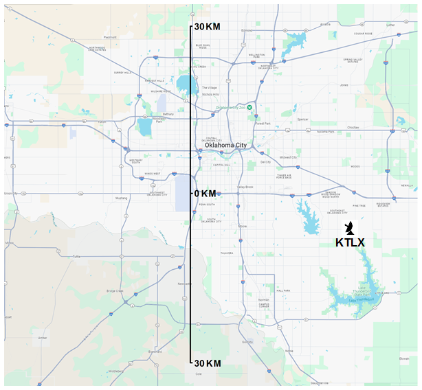 Figure 6Map of the Oklahoma City, Oklahoma, USA area with the Will Rogers Airport (OKC) runway centered at 0 km in the middle of the ruler, where the radar icon represents the KTLX location 29 km east-southeast of the mid-runway point (map image modified from the National Weather Service Damage Assessment Toolkit, https://apps.dat.noaa.gov/stormdamage/damageviewer/, last access: 1 December 2025).