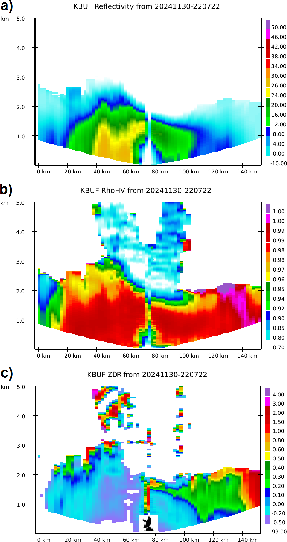Figure 9KBUF pCVP (10 km radius) of Z (a), ρhv (b), and ZDR (c), along I-90 from Dunkirk, NY (0 km), to exit 490 to Rochester (152.9 km); the radar icon represents the closest KBUF distance (∼ 235 m) relative to the pCVP at ∼ 76 km mark. 22:07 UTC, 30 November 2024.
