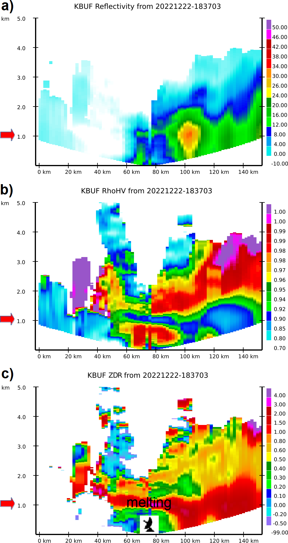 Figure 10KBUF pCVP (10 km radius) of Z (a), ρhv (b), and ZDR (c), along I-90 from Dunkirk, NY (0 km), to exit 490 to Rochester (152.9 km); red arrows highlight the approximate altitude of the melting layer; the radar icon represents the closest KBUF distance (∼ 235 m) relative to the pCVP at ∼ 76 km mark. 18:37 UTC, 22 December 2022.
