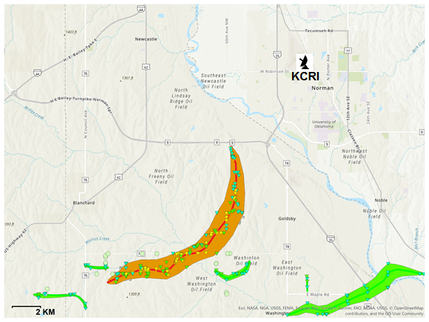 Figure 11Damage assessment of Cole OK, 20 April 2023, tornado. The red line shows the tornado damage path, whereas light green, green, yellow, and dark orange triangles represent EF0, EF1, EF2, and EF3 tornado reports along the preliminary path. The orange-shaded polygon presents the area affected by the tornado. The green polygons are associated with several EF1 tornadoes. The radar icon represents the KCRI radar location (map image modified from the National Weather Service Damage Assessment Toolkit, https://apps.dat.noaa.gov/stormdamage/damageviewer/, last access: 1 December 2025).