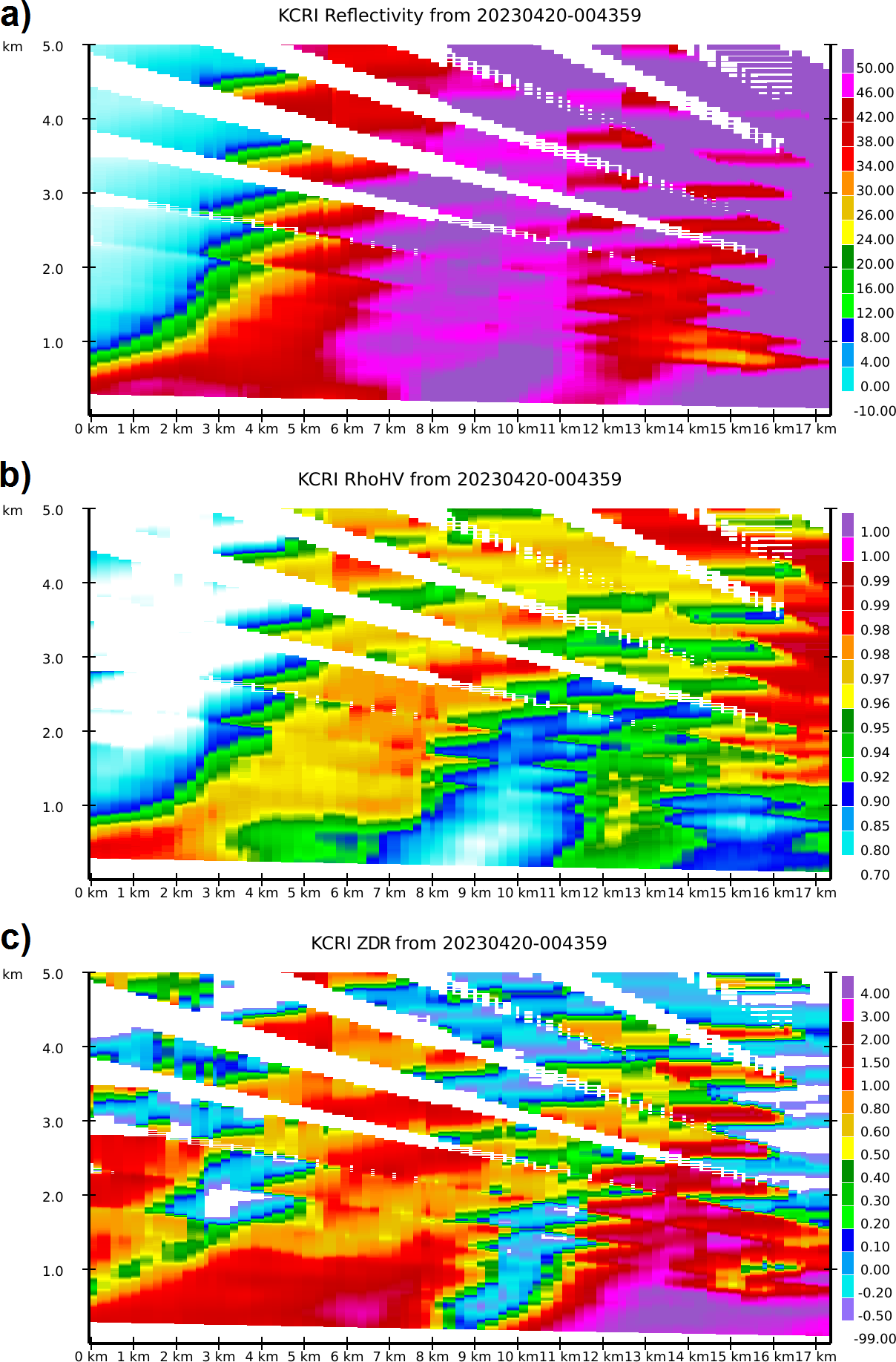 Figure 12KCRI pCVP (2 km radius) of Z (a), ρhv (b), and ZDR (c) depicting EF2-EF3 stage in Cole tornado evolution, 00:44 UTC, 20 April 2023. The tornado is located near the 8 km mark on the x-axis at the volume time starting at 00:44 UTC.