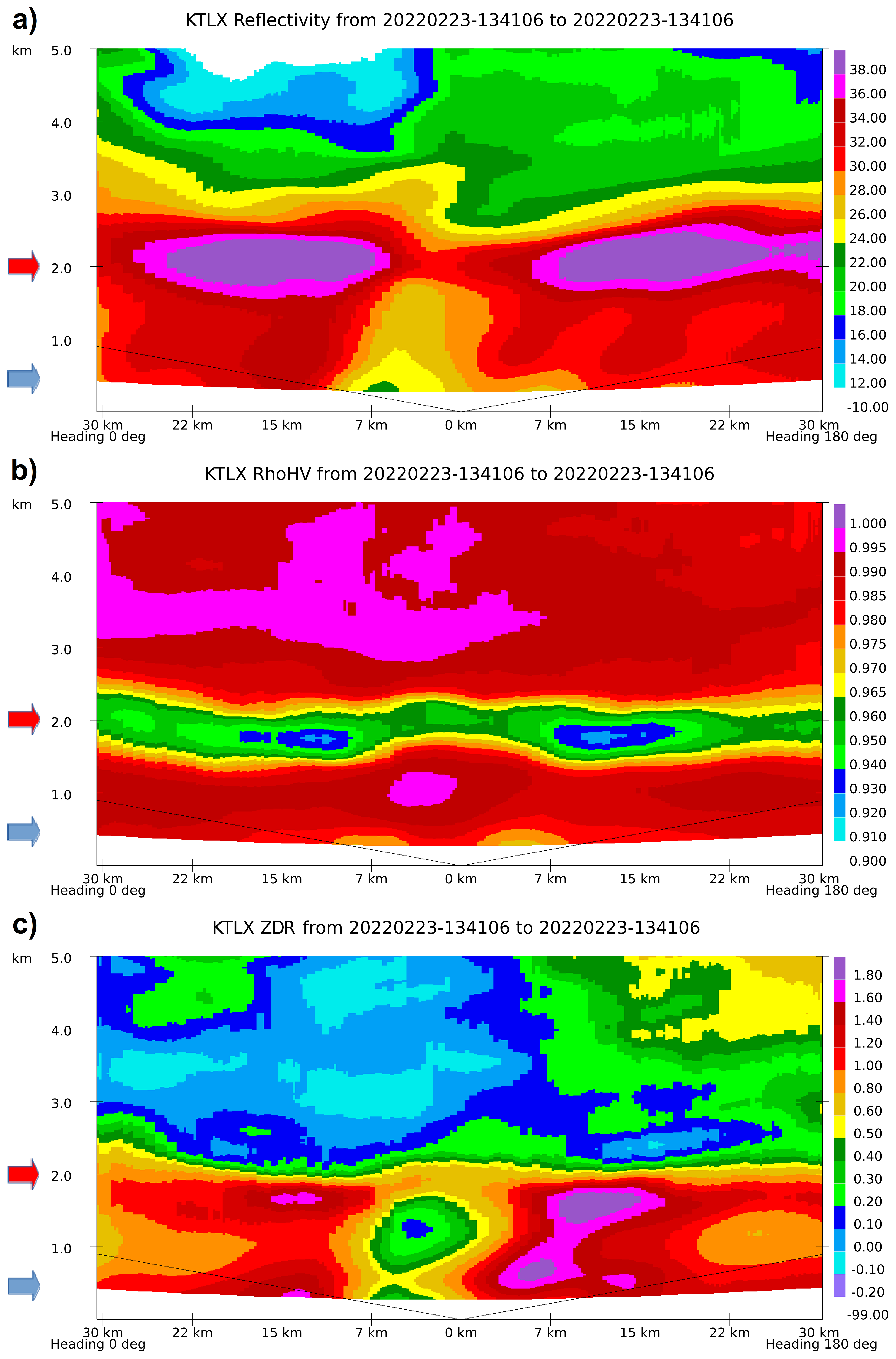 Figure 7KTLX pCVP (5 km radius) of Z, ρhv, and ZDR, aligned with Will Rogers airport runway in South-North (S-N) direction, where heading 0° represents true north, and 180° true south. The midpoint of the runway is located at the 0 km mark, and the runway length is ∼ 3.1 km. Refreezing of water drops is indicated ∼ 18.5 km south (north) of the airport along the flight path (black line), starting at ∼ 0.64 km a.g.l. until landing; red and blue arrows highlight the approximate altitudes of melting and refreezing layers; 13:41 UTC, 23 February 2022. (Note: the U.S.A. aviation community uses imperial units operationally.)