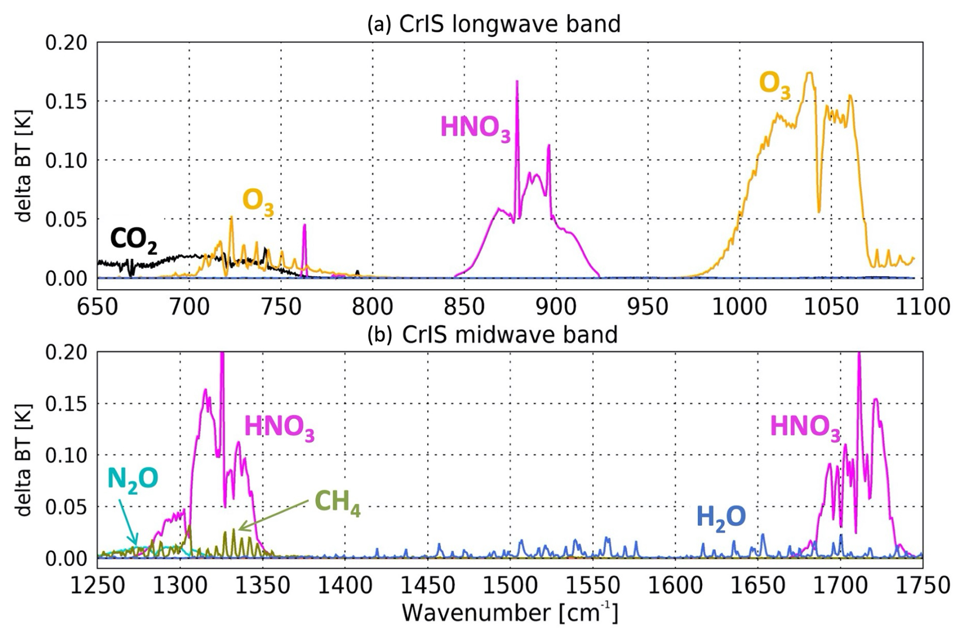 In Fig. 1, we highlight some of the CrIS spectral features to emphasize its sounding capability. CrIS measures the IR spectrum in three distinct bands: longwave IR (650–1095 cm−1), midwave IR (1210–1750 cm−1), and shortwave IR (2155–2550 cm−1). We limit our focus in Fig. 1 to the two CrIS bands that report significant sensitivity to HNO3, namely the longwave and midwave bands. The absorption features in Fig. 1 were calculated as the absolute difference in brightness temperature (delta-BT) [Kelvin] given a perturbation of the target variable. We used the Stand-alone AIRS Radiative Transfer Algorithm (SARTA; Strow et al., 2003) to calculate these delta-BT spectra with a CLIMCAPS sounding (i.e., the full suite of retrieved variables) as the background atmospheric state. Each target variable was perturbed in the lower stratospheric pressure layers (30–90 hPa), while keeping its value in all other layers constant.