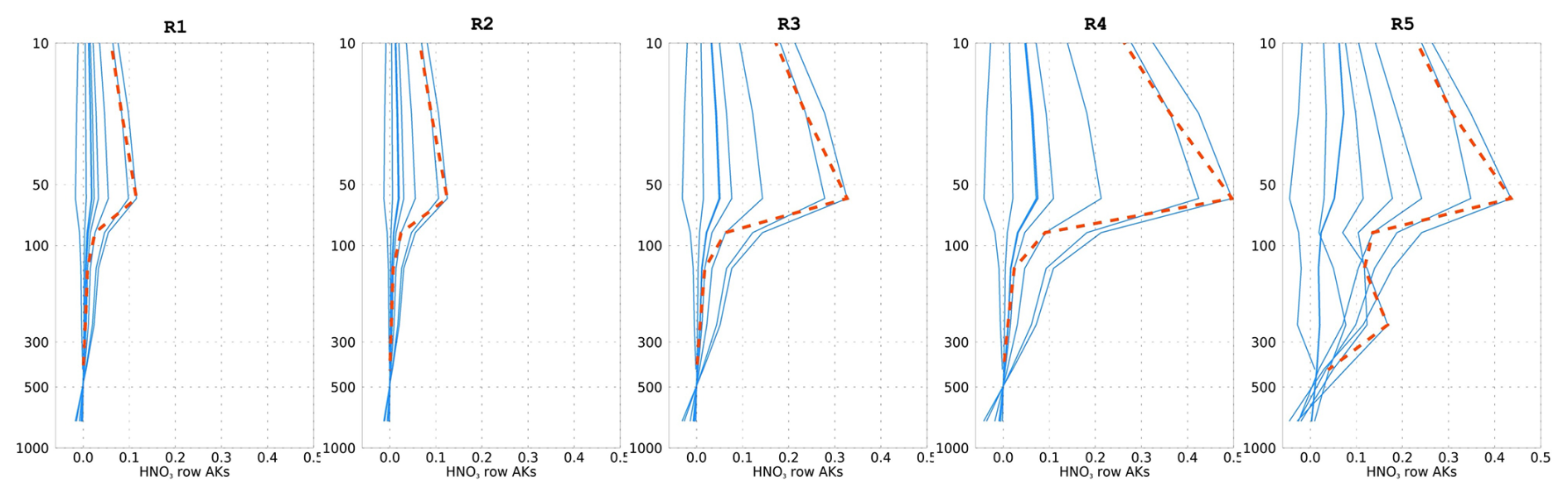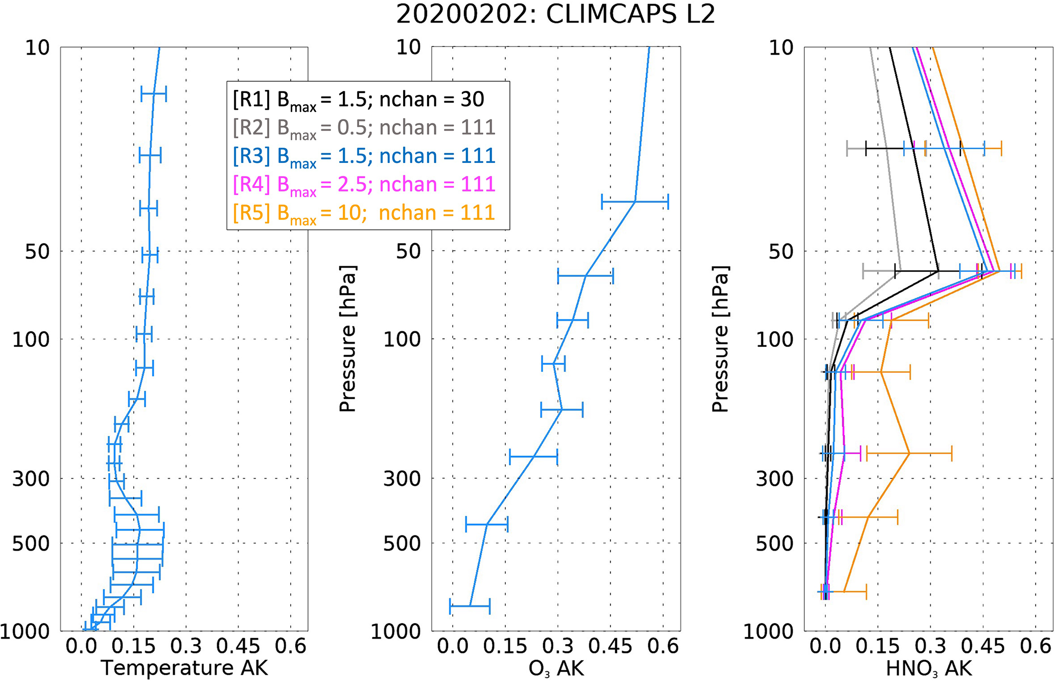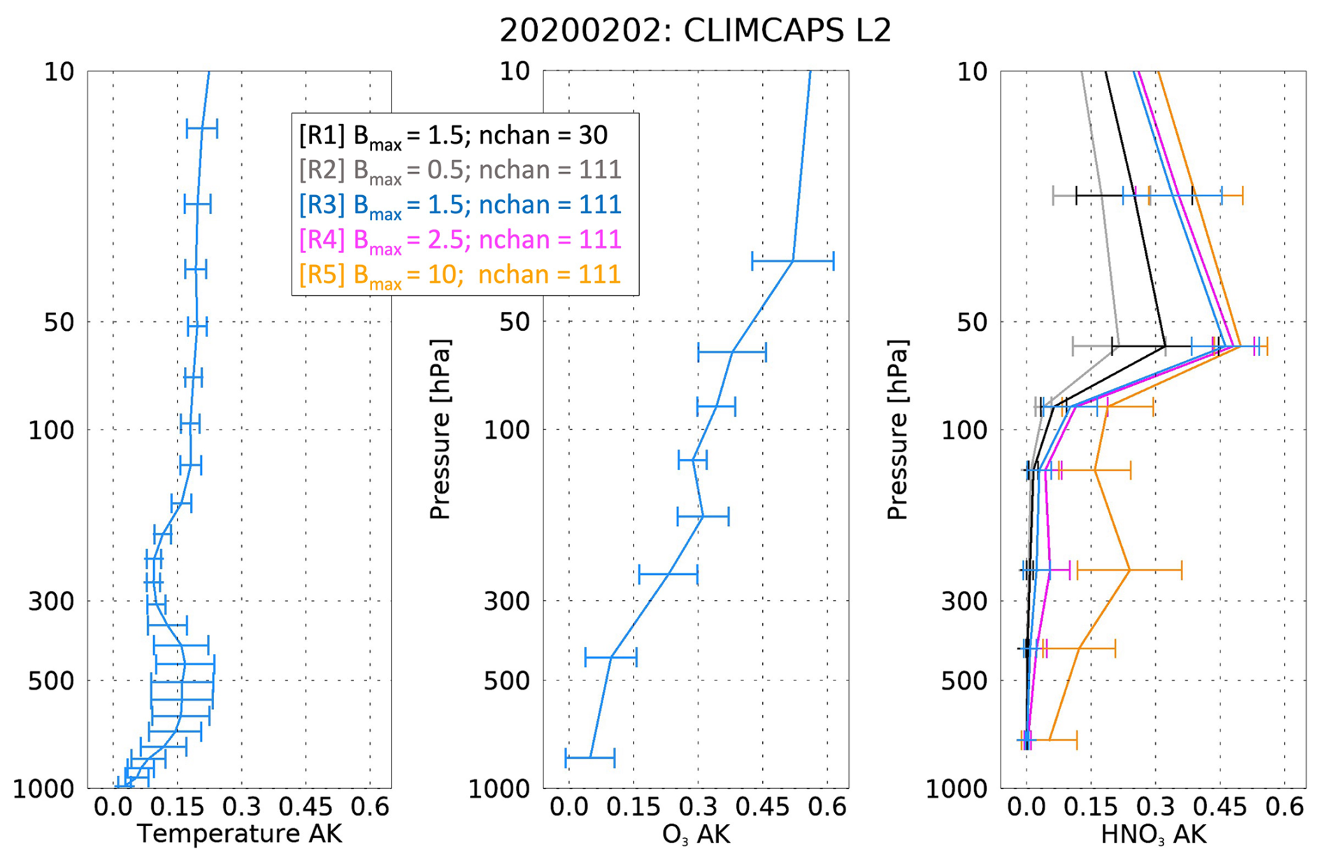 There are 5 HNO3 AKDs in Fig. 3, corresponding to the 5 experimental runs. As mentioned, R1 is closest to the CLIMCAPS V2.1 configuration, except that RTAERR = 0. The HNO3 AKs for all 5 runs have peak sensitivity in the lower stratosphere, 30–90 hPa. We selected all available CrIS channels in the longwave IR window region (850–920 cm−1) for the R2–R5 CLIMCAPS runs to maximize measurement SNR for the sake of illustration. This is the same spectral region exploited for HNO3 retrievals from GLORIA (Oelhaf et al., 2019) and IASI (Ronsmans et al., 2016). With everything else held constant, the only parameter that varies among R2 (grey), R3 (blue), R4 (magenta) and R5 (gold) is Bmax. It is, therefore, all the more remarkable to see how the corresponding HNO3 AKDs vary, not only in vertical structure, but also in their deviation about the mean in each effective pressure layer. R2 registers the lowest values for HNO3 AKs overall, and R5 the highest. R3 and R4 result in AKs with similar vertical structure and variance, with R4 having slightly higher AKD values in the middle to upper troposphere.