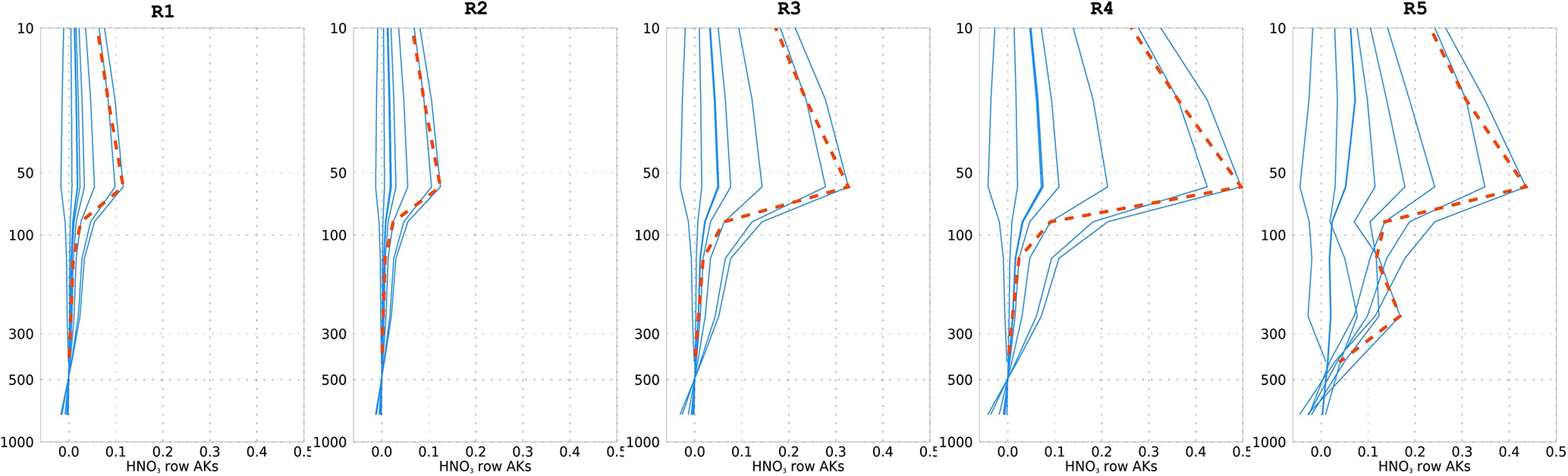 Figure 2The eight CLIMCAPS averaging kernel (AK) functions (blue lines) for an HNO3 retrieval on 2 February 2020 at 70.9° N, 80.9° E according to each of the five experimental configurations, (left) R1 to (right) R5. CLIMCAPS retrieves HNO3 on 8 broad pressure layers as defined in Table 1. The dashed red line is the diagonal vector of the 8 × 8 AK matrix to summarize the peak SNR of each AK function.