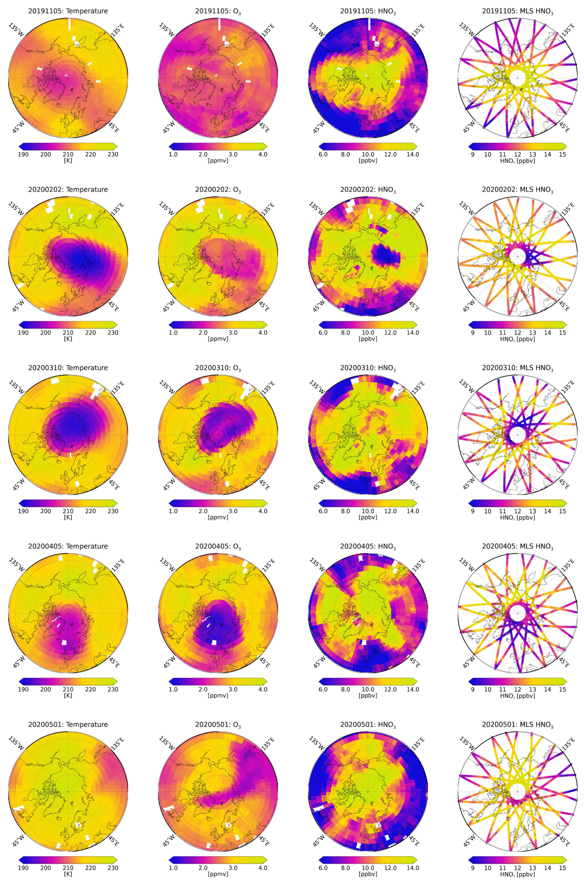 Figure 5A time series of lower stratospheric CLIMCAPS retrievals of Tair, O3, and HNO3 produced by the R4 experimental configuration aggregated onto a 4° equal-angle grid throughout the 2019/2020 Northern Hemisphere winter 635 season poleward of 40° N latitude. The column on the right represents the MLS V5 Level 2 profile HNO3 retrievals at 1.5° intervals. Both the CLIMCAPS and the MLS profile products were vertically integrated across their respective retrieval layers spanning 30–100 hPa.