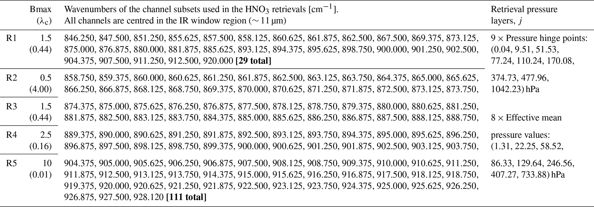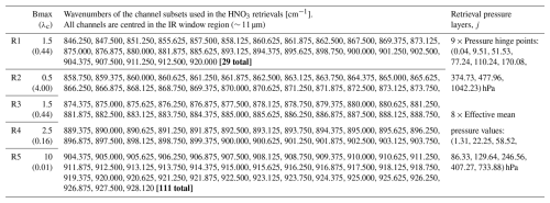 Table 1Summary of the 2 CLIMCAPS HNO3 algorithm components – Bmax and channel selection – tested in this study. Four different Bmax values and 2 different channel selections define 5 experimental setups in total, R1–R5. The righthand column specifies the 9 pressure hinge points and 8 effective mean values of the pressure layers on which CLIMCAPS retrieves HNO3.