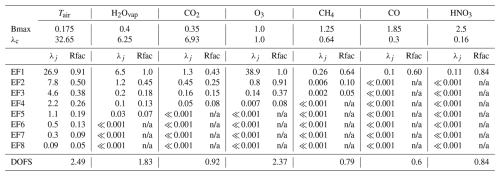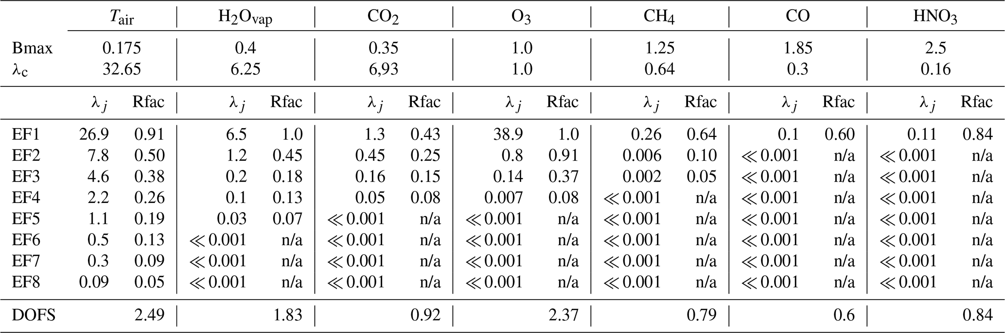 Table 2Eigenvalues and DOFS from an R4 run for seven retrieval variables – Tair, H2Ovap, CO2, CO, CH4, O3 and HNO3 – at a single retrieval footprint. Row 1 reports the static Bmax threshold (and corresponding λc value) that CLIMCAPS employs at run-time to determine the degree of regularization for the Bayesian inverse solution. Row 2 details the eigenvalues (λj) and corresponding regularization factor, Rfacj,of the top eight eigenfunctions (EF1–EF8). No eigenvalues with Rfacj < 5 % are considered in the retrieval (or damped 100 %). The bottom row reports the DOFS calculated as the sum total of all Rfacj values.
