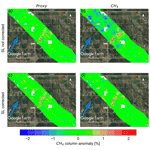 where the relative enhancement CH is normalized with the local relative background and scaled with the assumed background column of CH4 in molec cm−2 from the RTM. The relative background is estimated from the local background around the plume.
