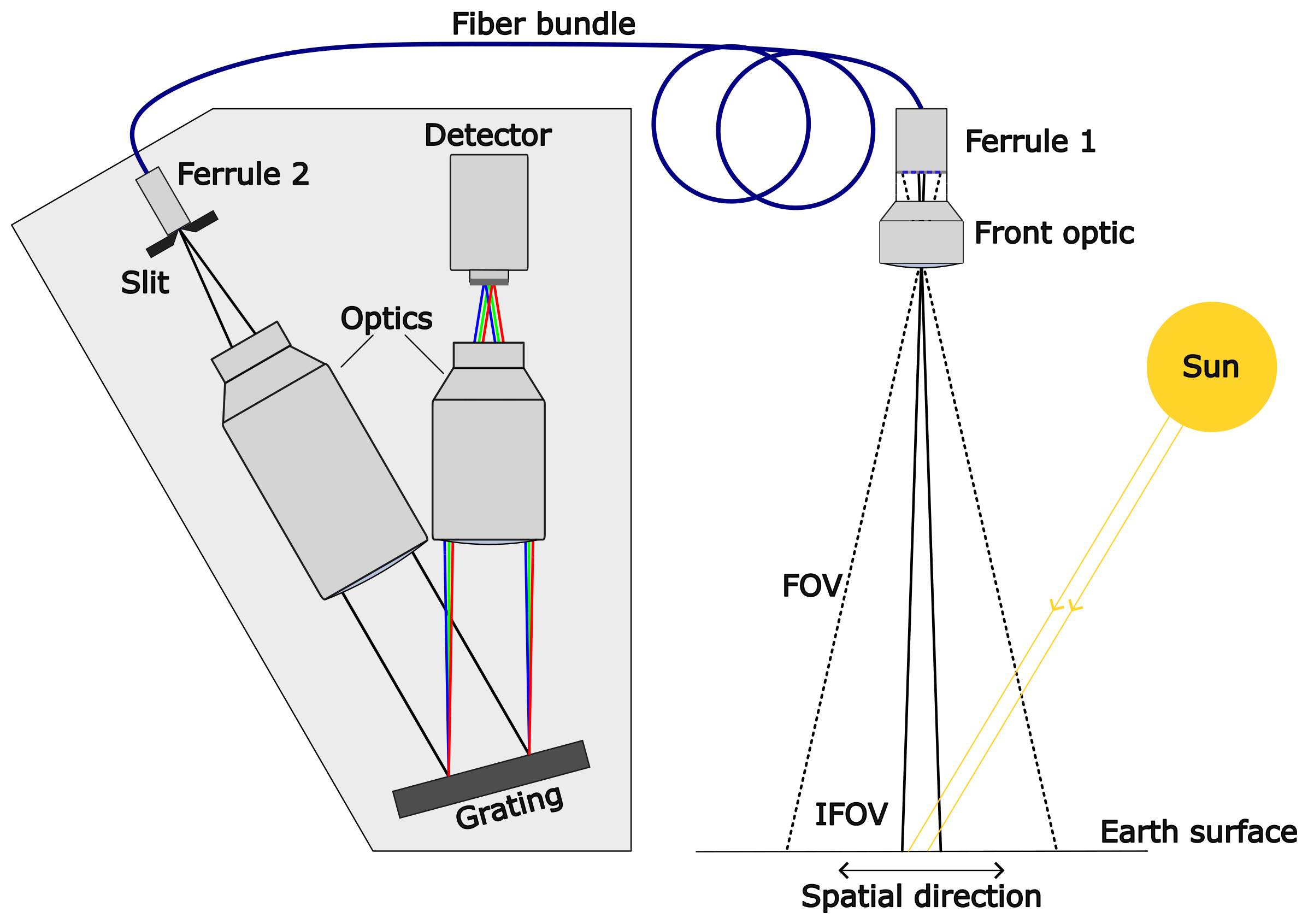 Figure 1Schematic optical setup of the MAMAP2D-Light instrument. The sunlight reflected from the Earth's surface is imaged by the front optic onto the input of a fiber bundle with 36 fibers stacked in Ferrule 1, where each fiber corresponds to a single spatial ground scene. The radiation enters the spectrometer block through the fibers in Ferrule 2. The fibers are stacked perpendicular to the optical bench of the spectrometer block. To adjust the linewidth of the spectrometer, a Slit aperture is placed in the entrance focal plane. The radiation is dispersed and imaged at the 2D detector with the two optics and the grating. The area of a single fiber together with the focal length of the front optics defines the instantaneous field of view (IFOV). 28 fibers are imaged at the detector, determining the field of view (FOV).
